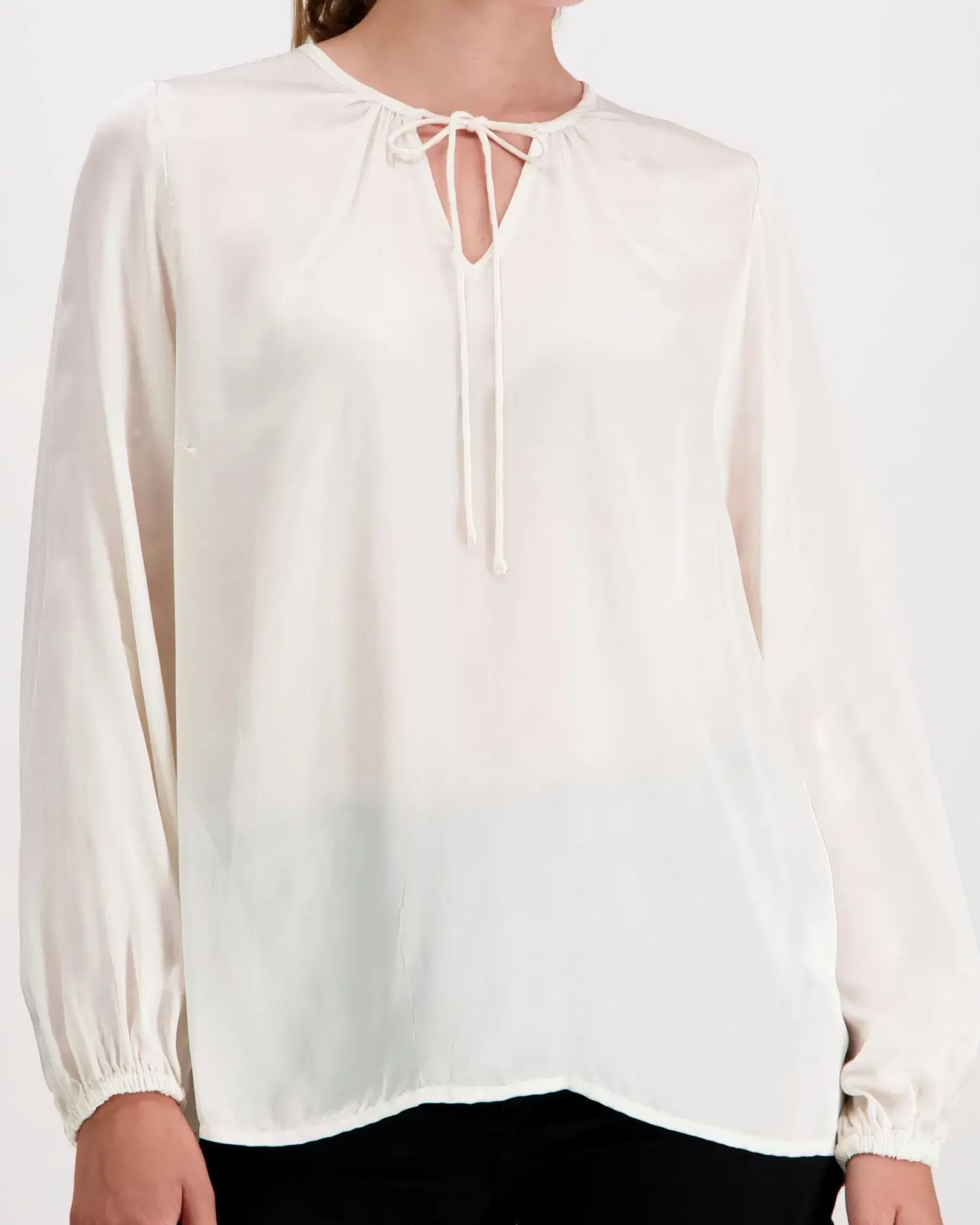 Viskoosipusero pyöreällä pääntiellä. Edessä solmittavat nauhat, hihansuilla kuminauhat ja pyöristetty helma.