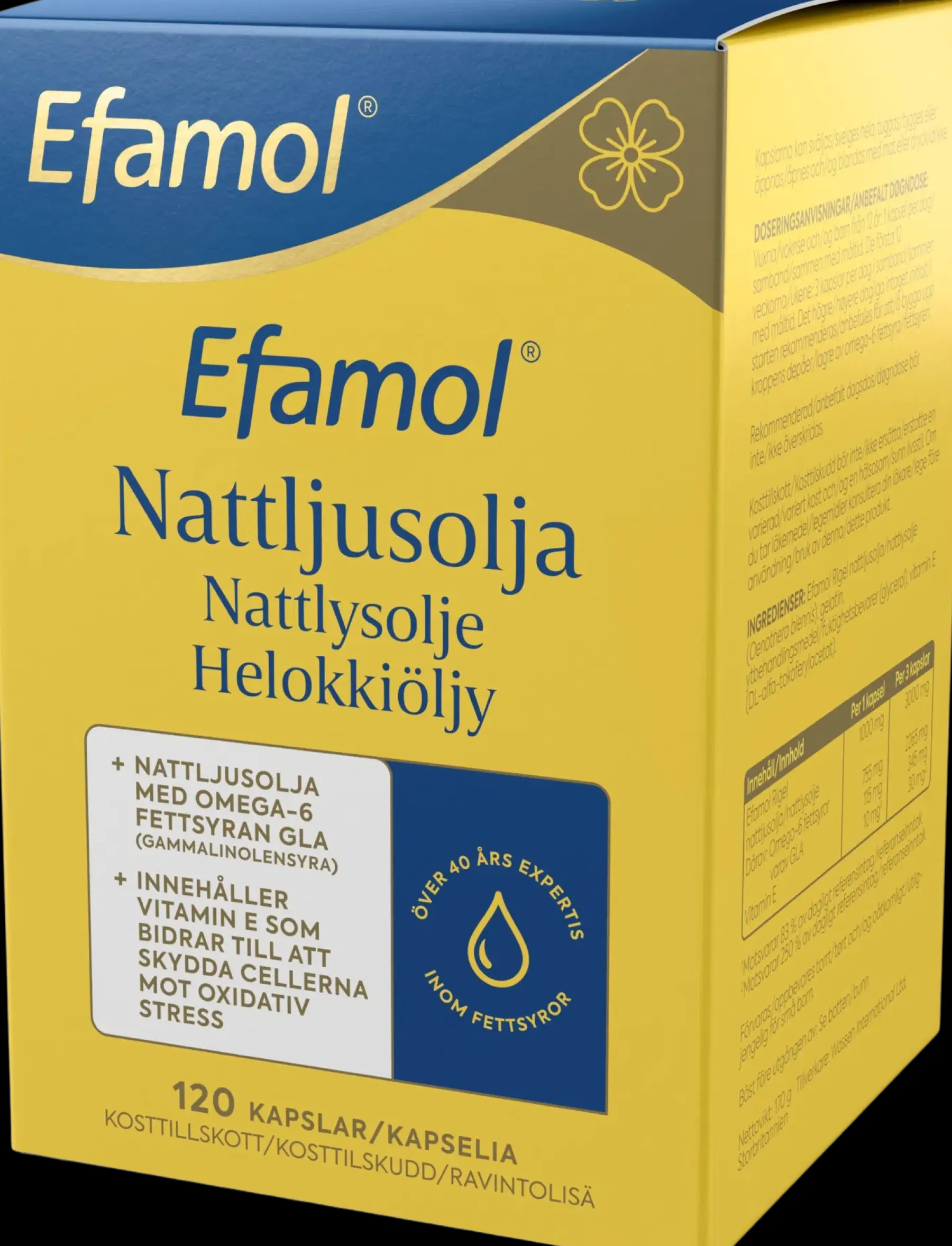 Efamol Rigel-helokkiöljy (Oenothera biennis), livate, kosteudensäilyttäjä (glyseroli), DL-alfa-tokoferyyliasetaatti.