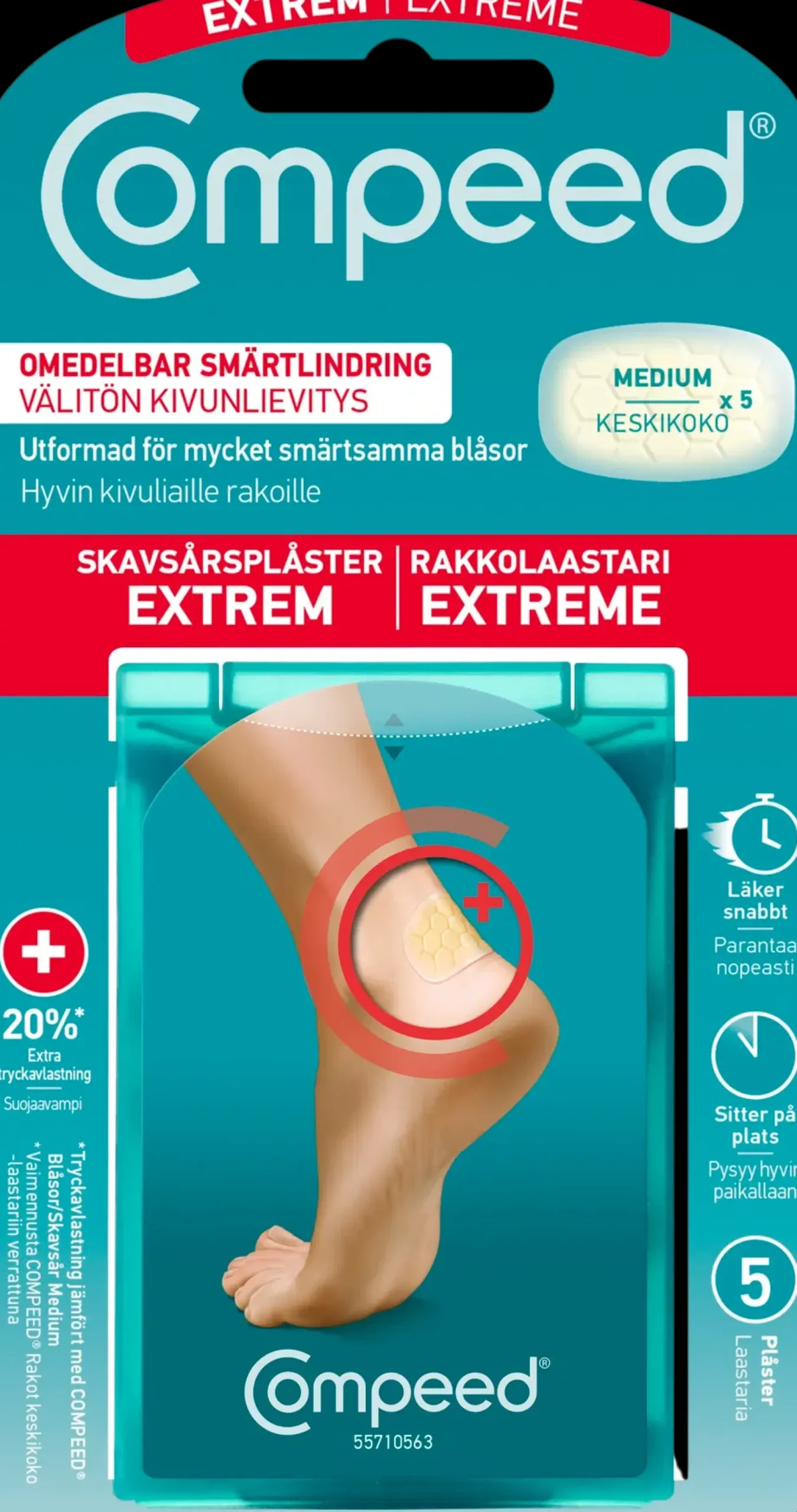 COMPEED® Extreme Rakkolaastari on muotoiltu hyvin kivuliaille rakoille. Lievittää kipua nopeasti ja hunajakennomuotoilu antaa 20 % lisävaimennusta* hiertymiä vastaan verrattuna COMPEED® Medium -rakkolaastareihin. Toimii kuin toinen iho, on huomaamaton ja vedenkestävä.