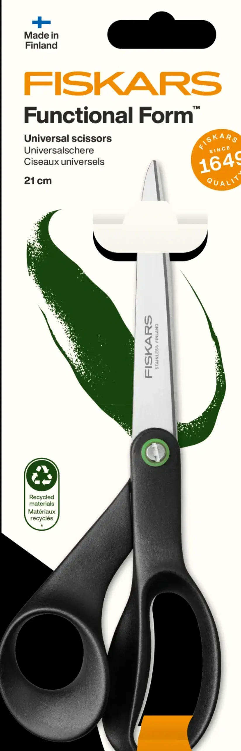Fiskars Functional Form ReNew -yleissakset soveltuvat monenlaisiin kodin leikkuutöihin, ja ne on valmistettu vähintään 70-prosenttisesti kierrätysmateriaaleista. Korkealaatuiset ruostumattomasta teräksestä valmistetut terät takaavat erinomaisen leikkuutehon. Kierrätysmuovin ja lasikuidun yhdistelmästä valmistettu ergonominen kädensija tarjoaa ainutlaatuisen käyttömukavuuden ja hyvän otteen. Sakset on valmistettu ympäristösertifioidulla Suomen tehtaallamme, ja ne on viimeistelty käsin. Sakset sopivat oikeakätisille.