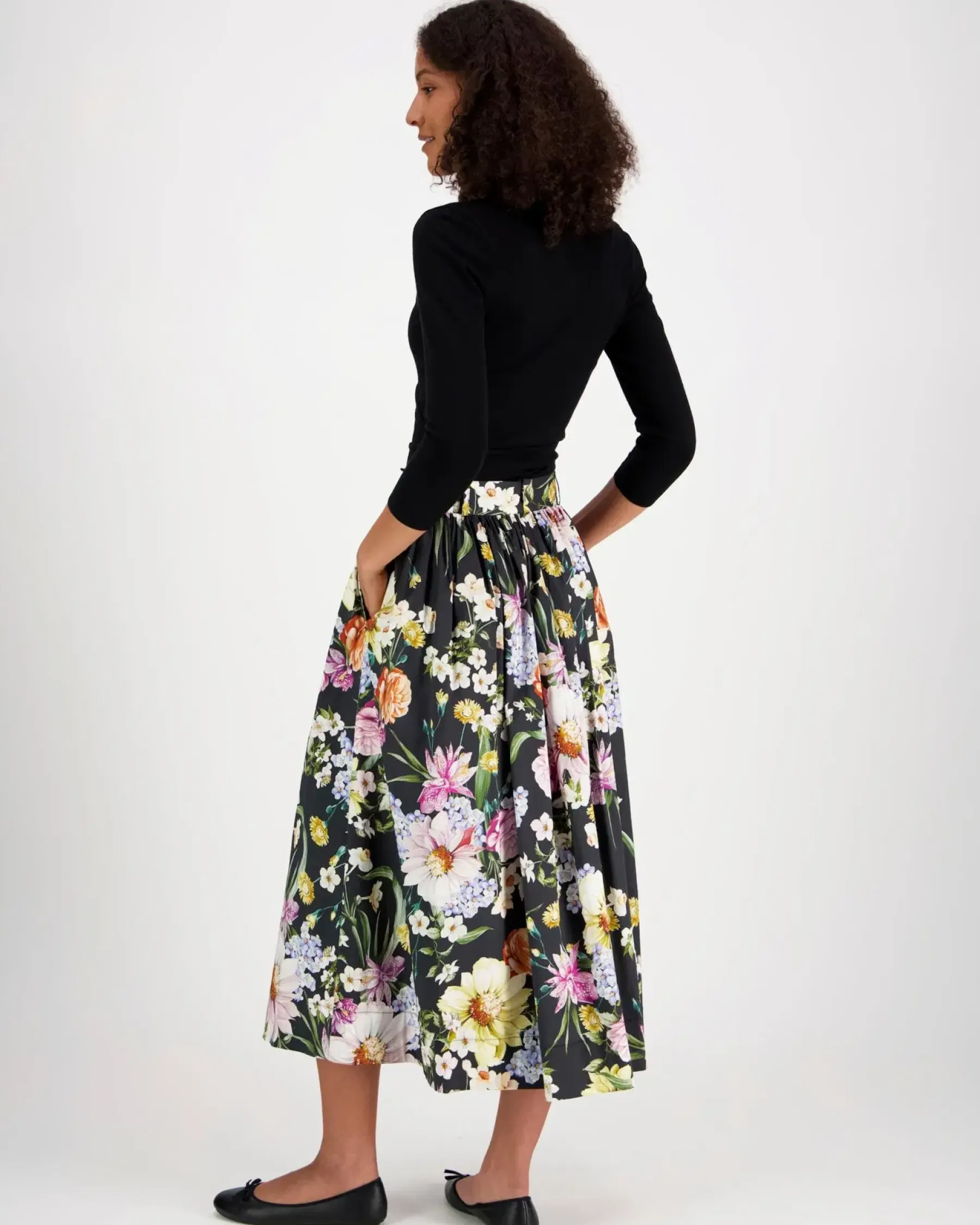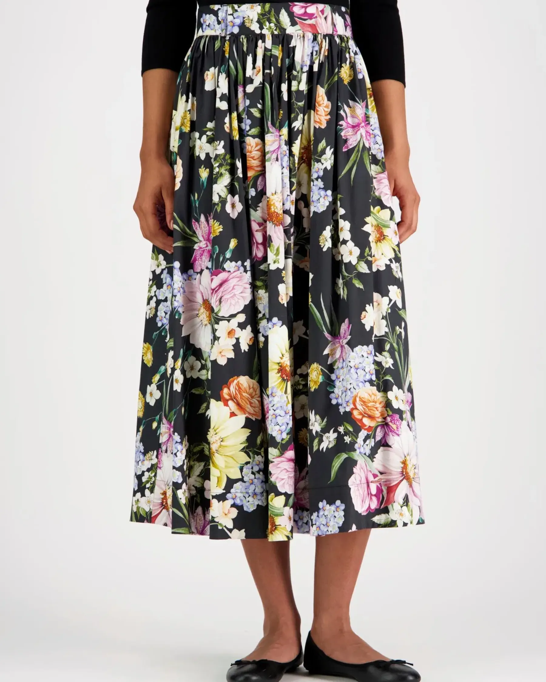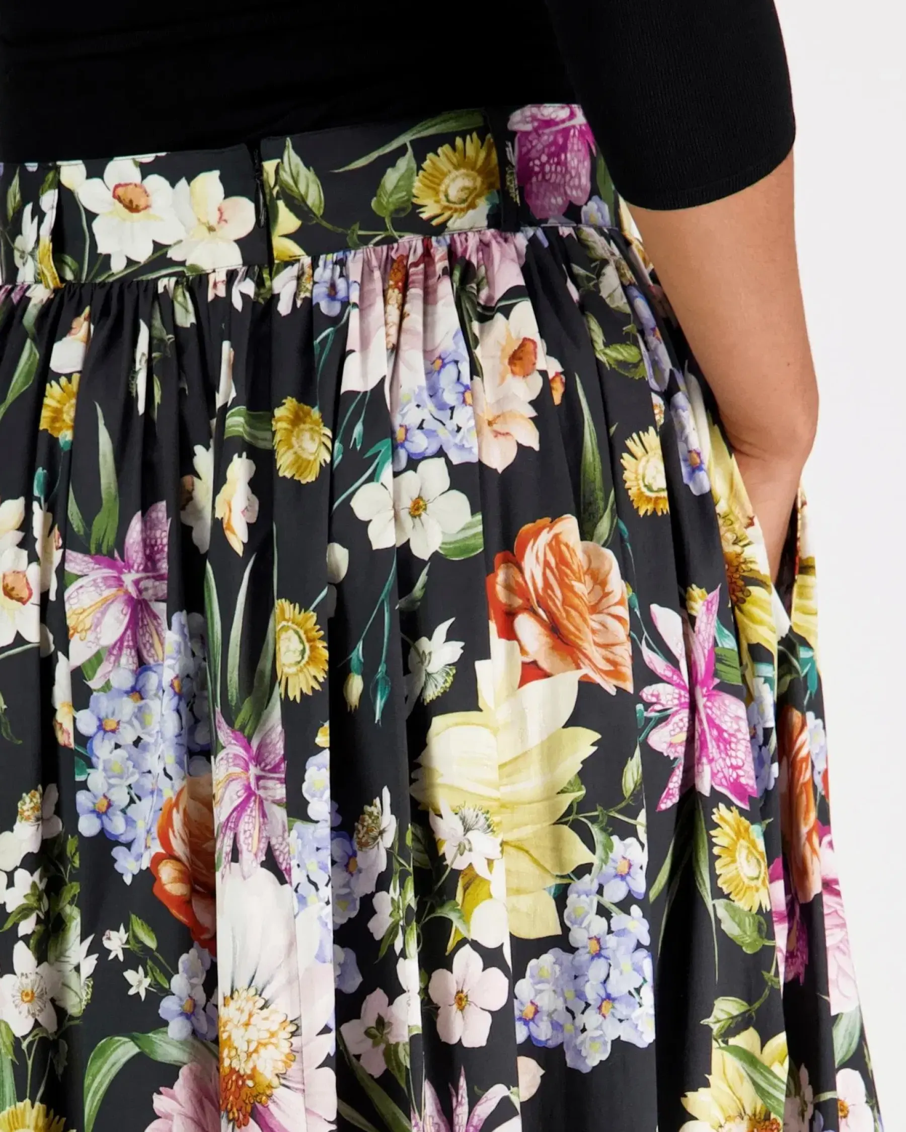 Poimitettu hame jossa A-linjainen siluetti, keskipitkä helma, sivutaskut ja vyölenkit.