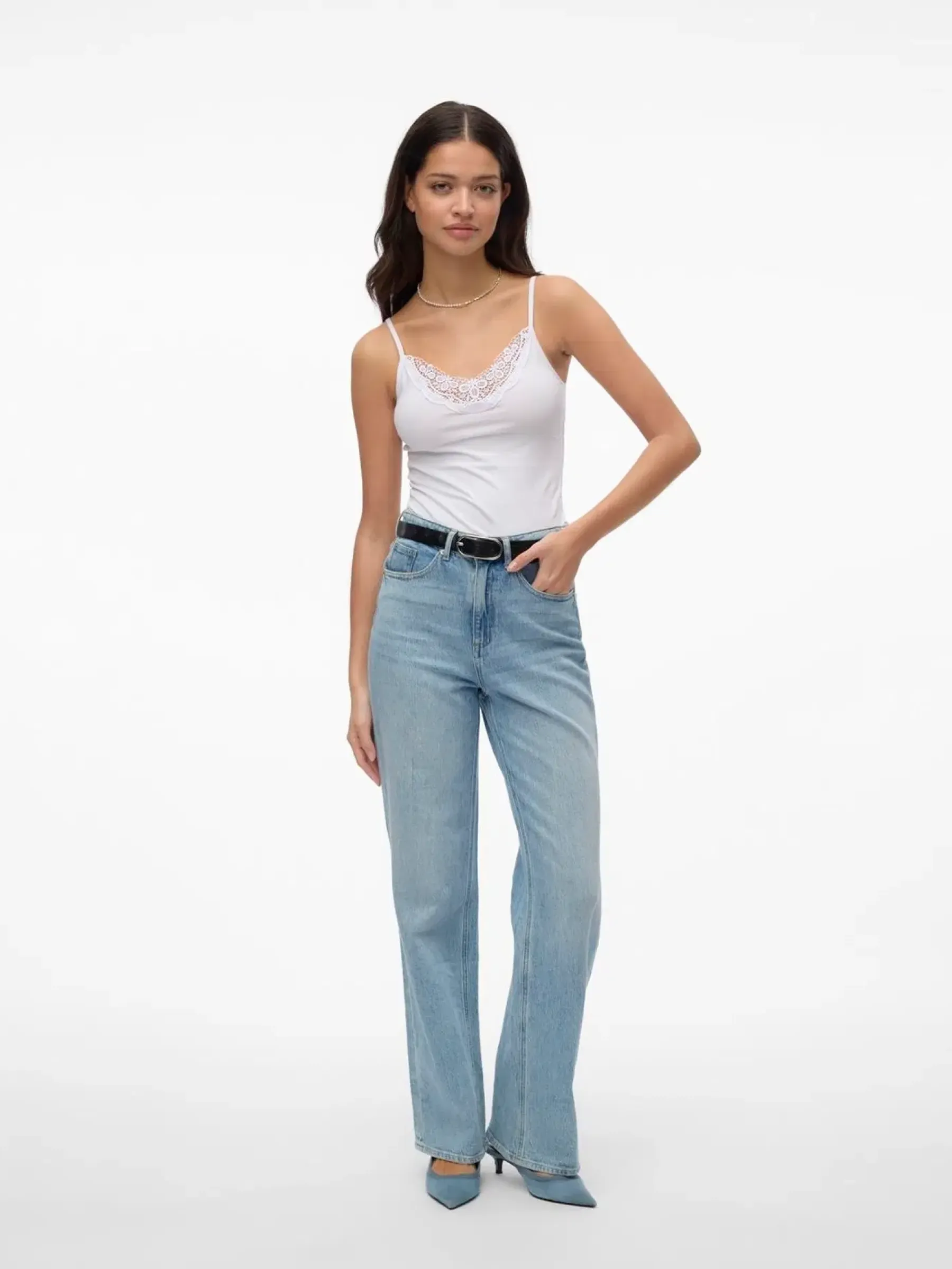 Naisten joustava, slim fit – mallinen, puuvillainen toppi. Topissa on naruolkaimet, pääntiessä päälle ommeltu pitsiyksityiskohta ja v-pääntie.