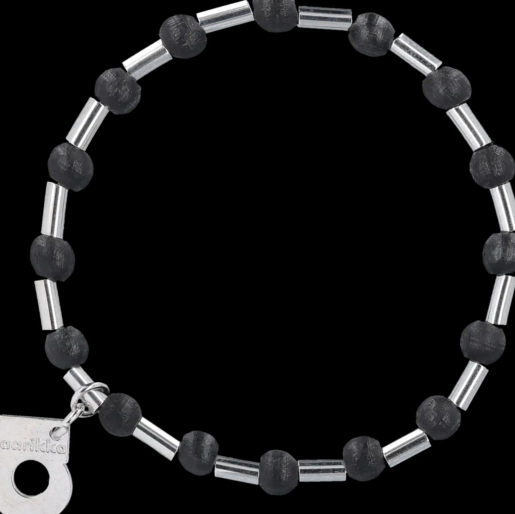 Mila-koruissa on tyylikkäästi yhdistetty metalliputkia ja puuhelmiä. Rannekoru on joustava ja se sopii ranteelle, jonka ympärysmitta on 16–19 cm. Valmistettu käsityönä Suomessa.