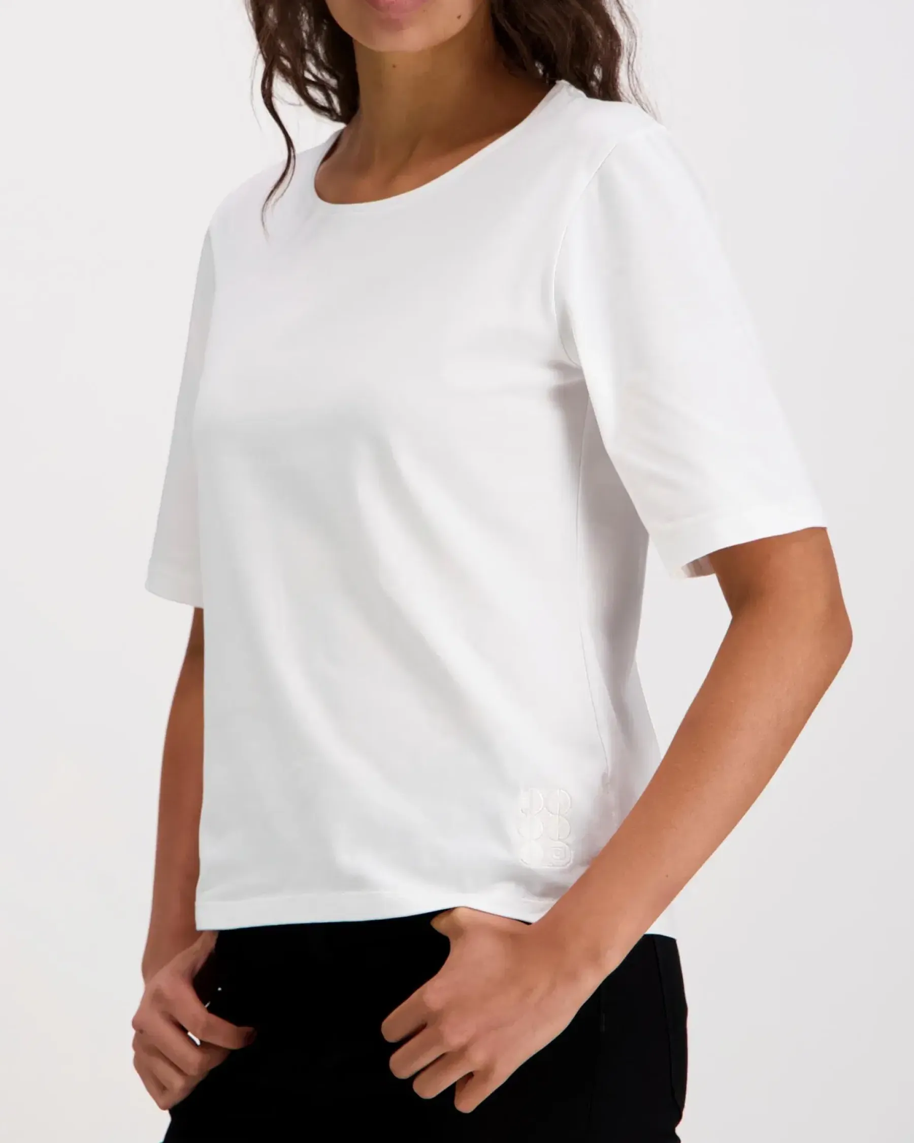 Aarikan lyhythihainen Ninnu-on ryhdikäs ja huoleton t-paita. Pääntie on viimeistelty tereellä ja helmassa on brodeeraus, hihat ovat lyhyet. Pituus hartiasta helmaan koossa S on 60 cm.