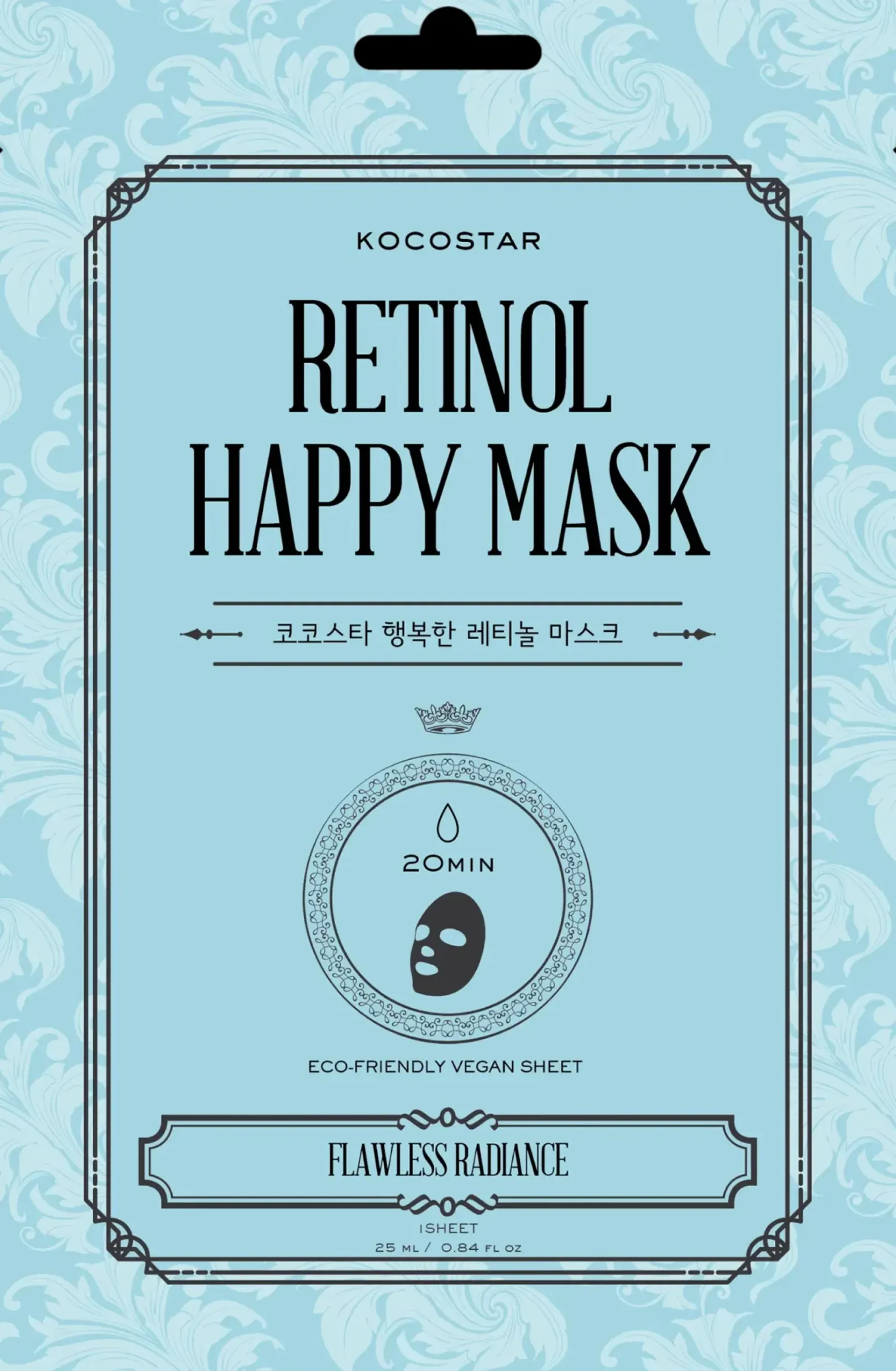 Retinol Happy Mask sisältää retinolia, A-vitamiinin johdannaista, jolla on voimakkaita anti-aging-vaikutuksia ja ihoa puhdistavia ominaisuuksia. Retinolin tiedetään lisäävän kollageenin tuotantoa ja tehostavan ihon uusiutumista, mikä voi madaltaa juonteita ja ryppyjä sekä kiinteyttää ihoa. Retinoli auttaa myös akneen taipuvaista ihoa vähentämällä talintuotantoa, tasoittamalla ihon tekstuuria ja häivyttämällä arpia ja hyperpigmentaatiota. Naamio sisältää myös ihon sävyä tasoittavaa niasiiniamidia sekä ihon kimmoisuutta lisäävää ja kosteuttavaa kasviperäistä kollageenia. Näiden aktiivisten ainesosien yhdistelmä saa ihon näyttämään säteilevältä ja raikkaalta sekä tuntumaan pehmeältä. Naamion ympäristöystävällinen materiaali on valmistettu 100-prosenttisesti kasvikuidusta, joka kiinnittyy hyvin iholle ja mahdollistaa seerumin tehokkaan imeytymisen ihoon.