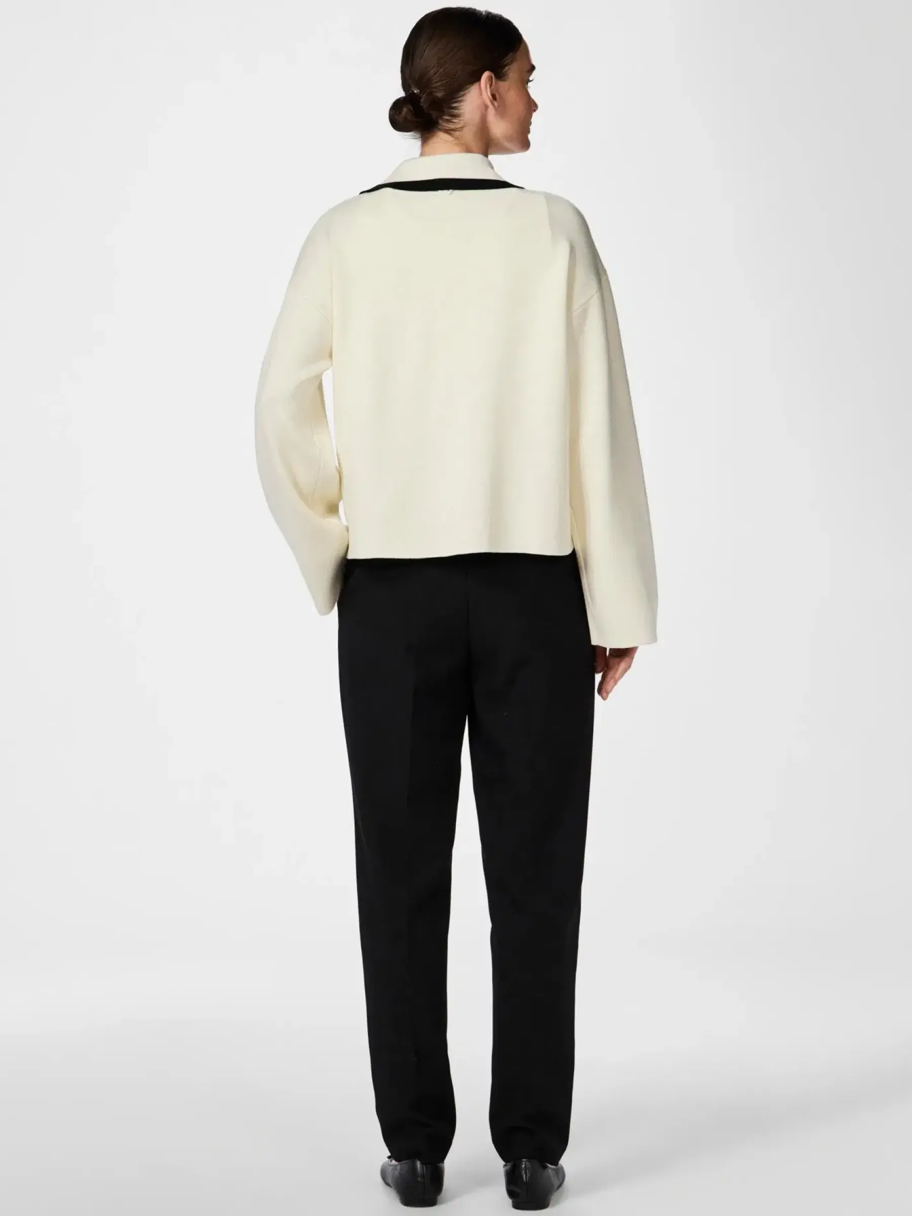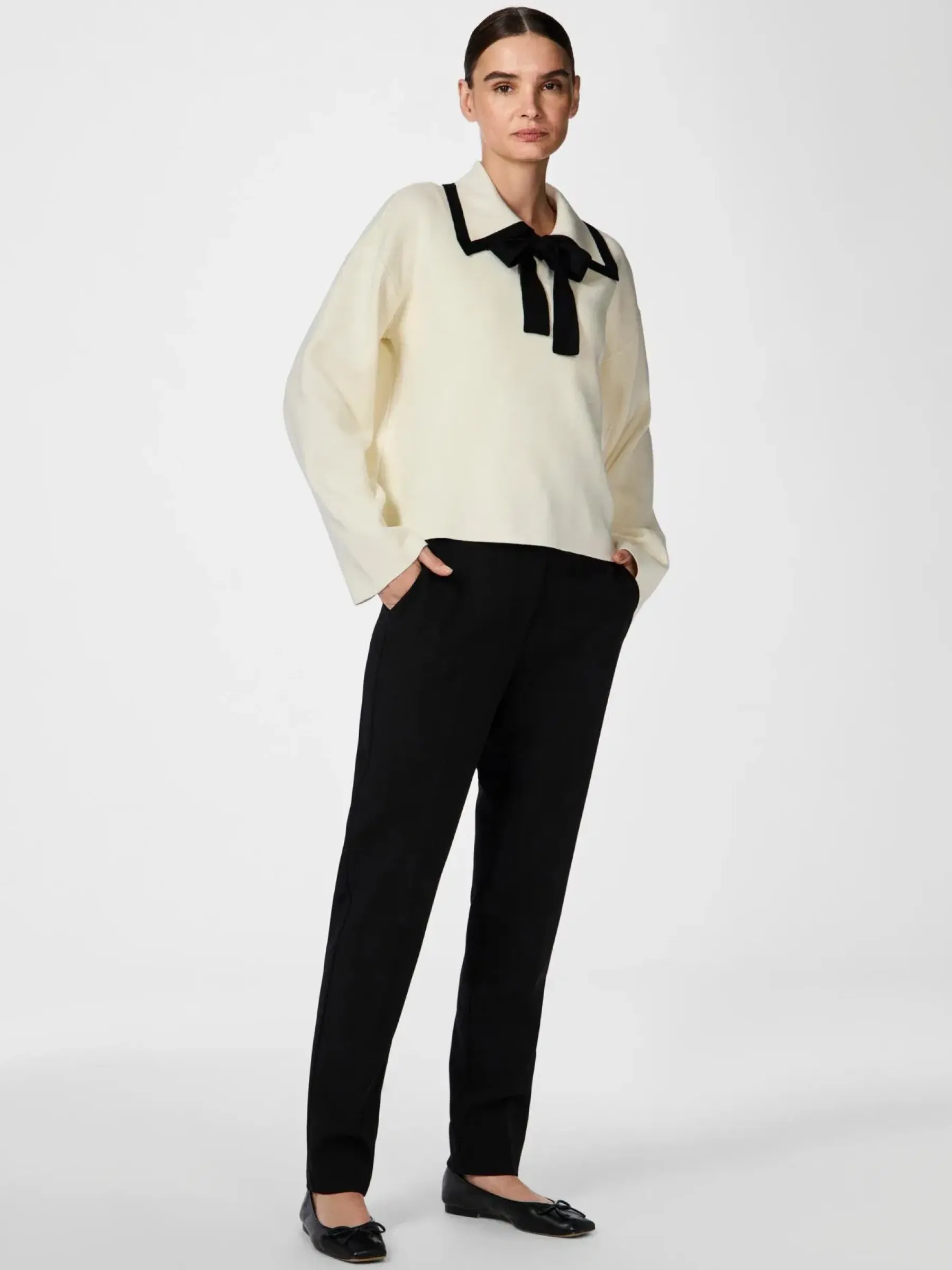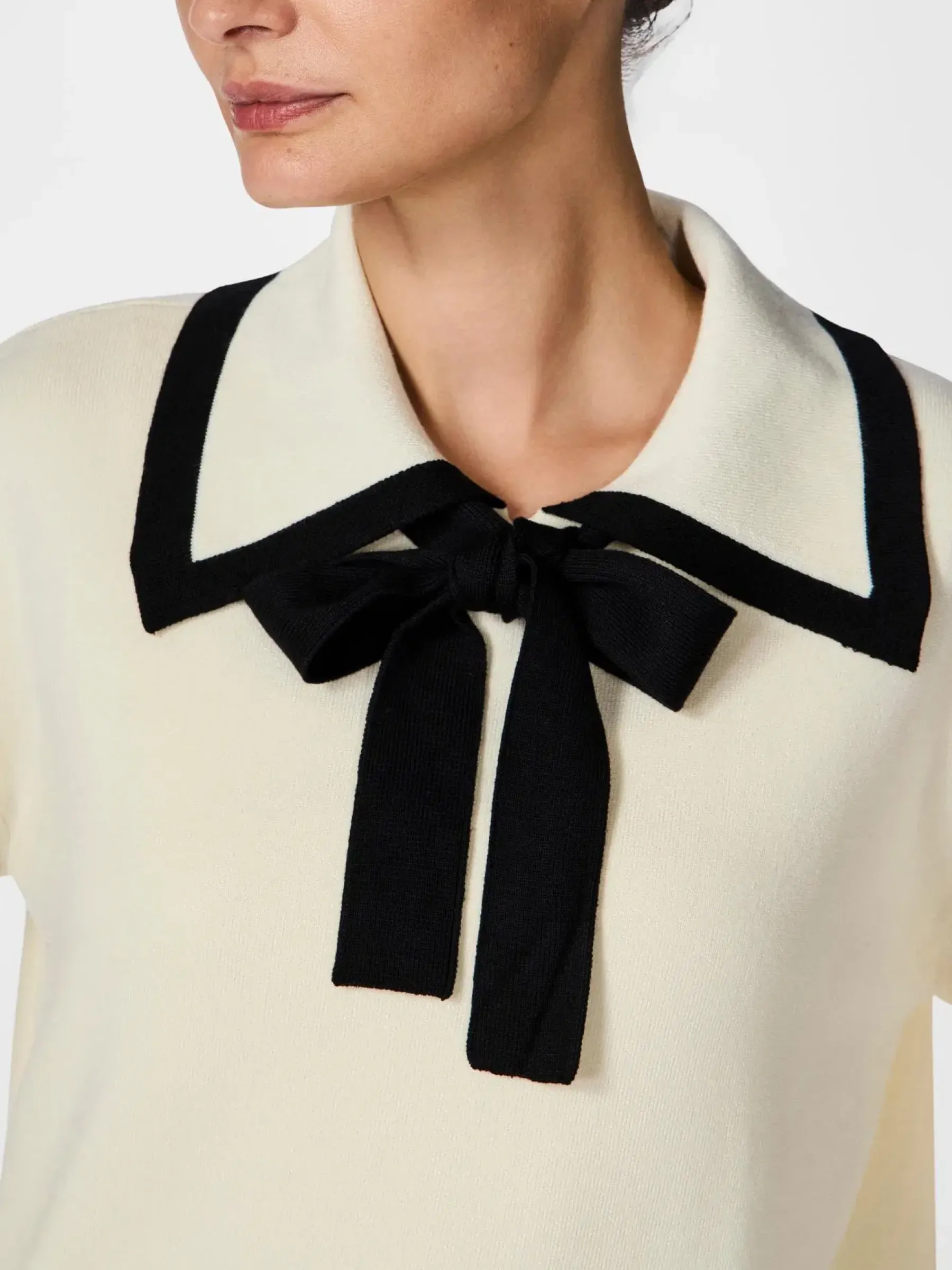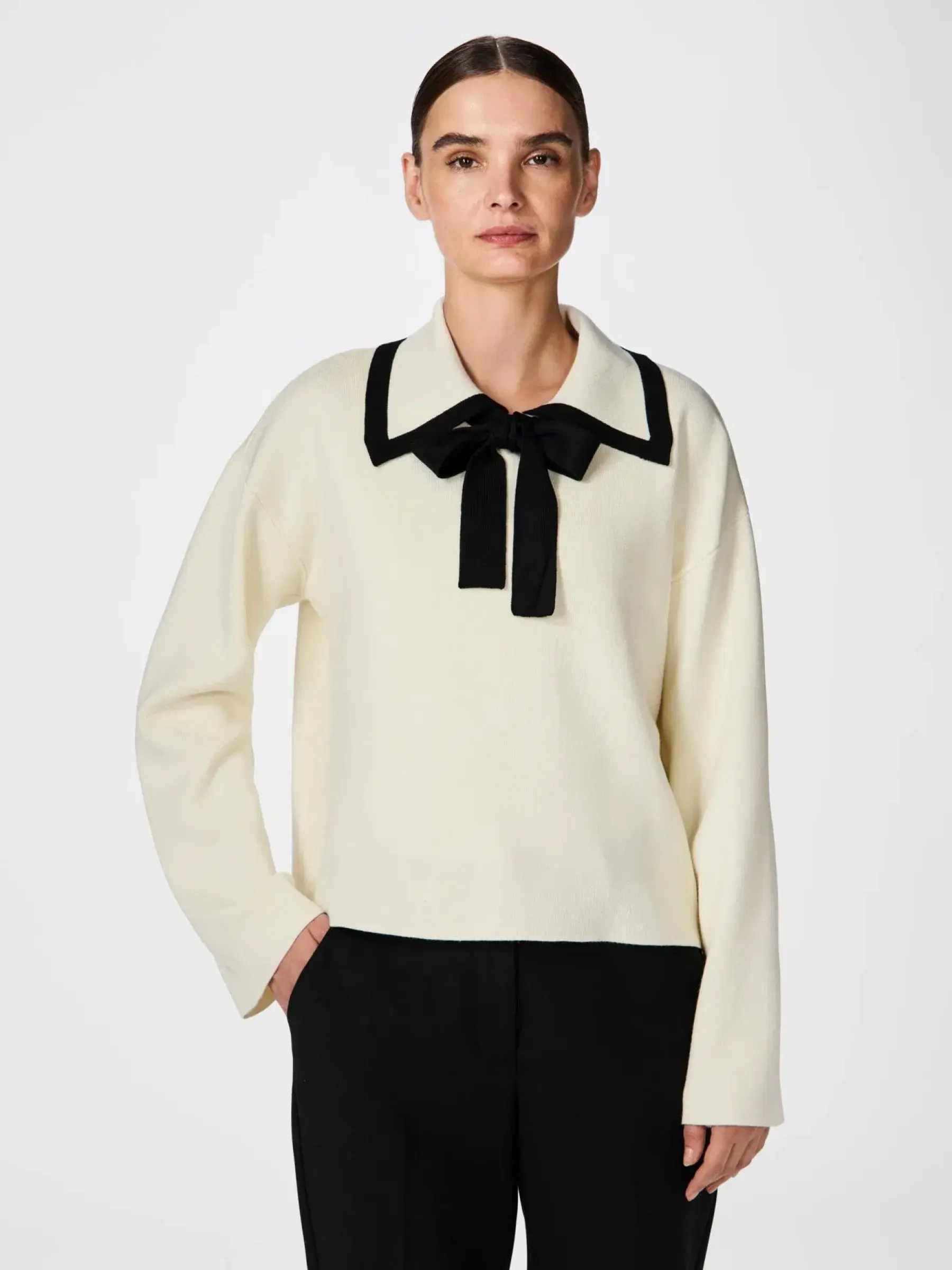 Pitkähihainen neulepusero rusettiyksityiskohdalla ja koristeellisella kauluksella.