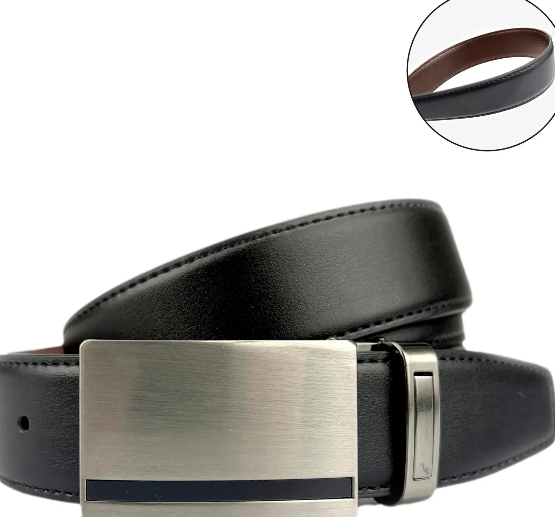 Mustaruskea nahkakääntövyö nikkelivapaalla hopeansävyisellä laattasoljella.