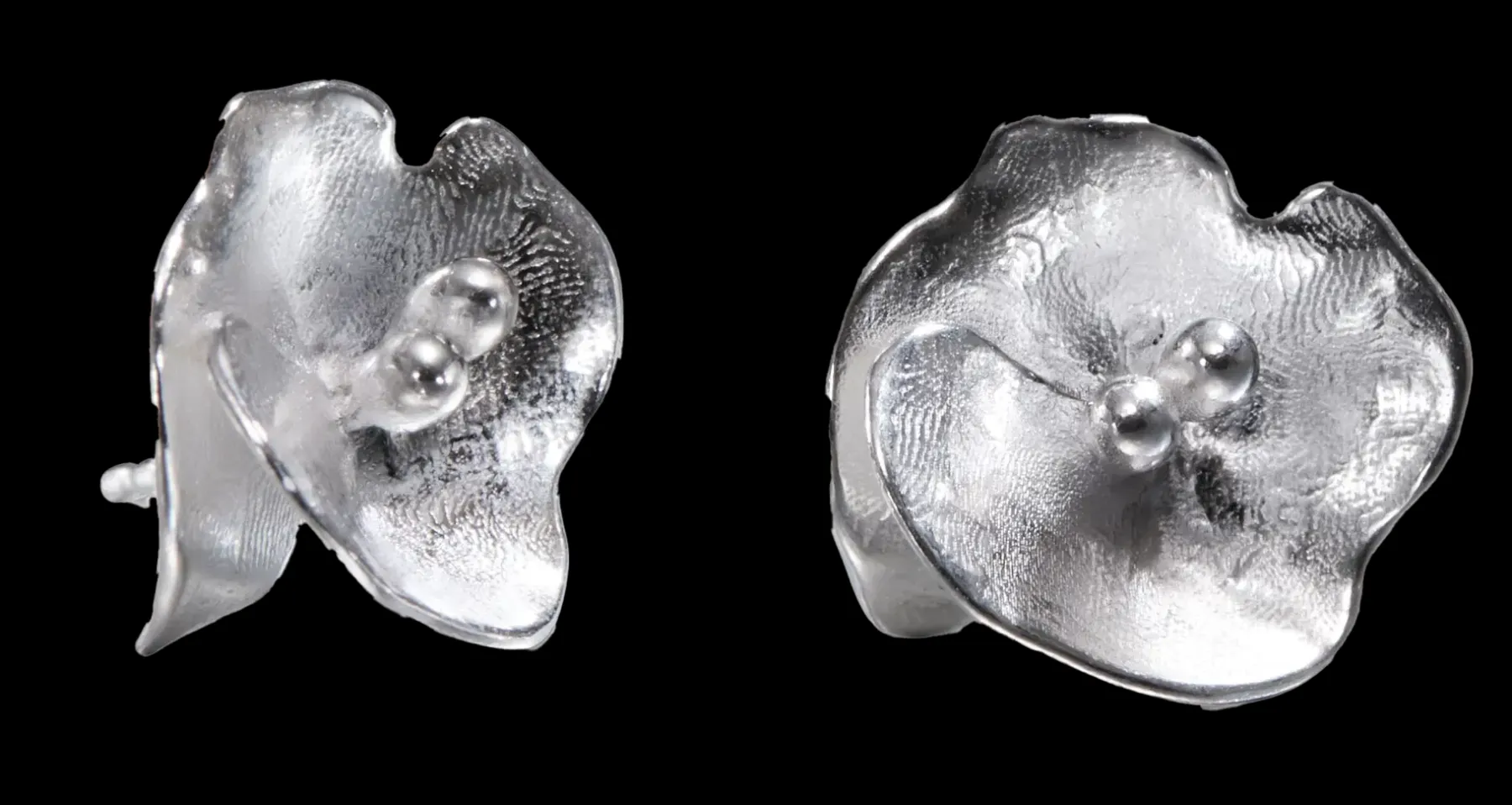 Juhannusruusujen herkkä kauneus puhkeaa kukkaan veistoksellisissa Kesäyön ruusu -korvakoruissa. Tappikiinnitys, tappi ja taustanasta hopeaa. Korvakorut eivät ole toistensa peilikuvat. Halkaisija 14 mm.