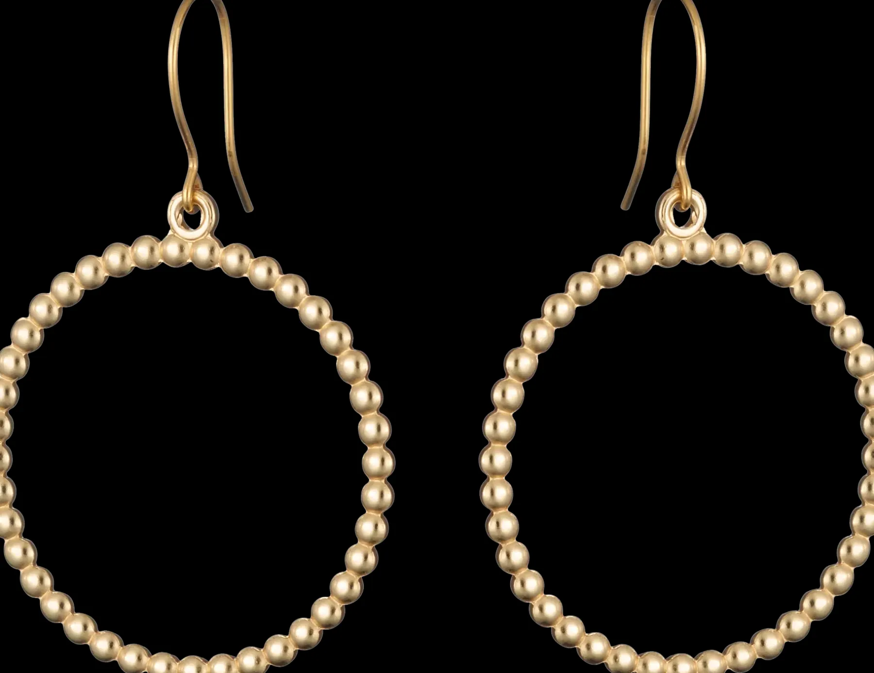 Valoisa-sarjan isot rengaskorvikset kirkkaasta, kullanhohtoisesta pronssista valmistettuina. Koukut kullattua hopeaa. Korun halkaisija 35 mm