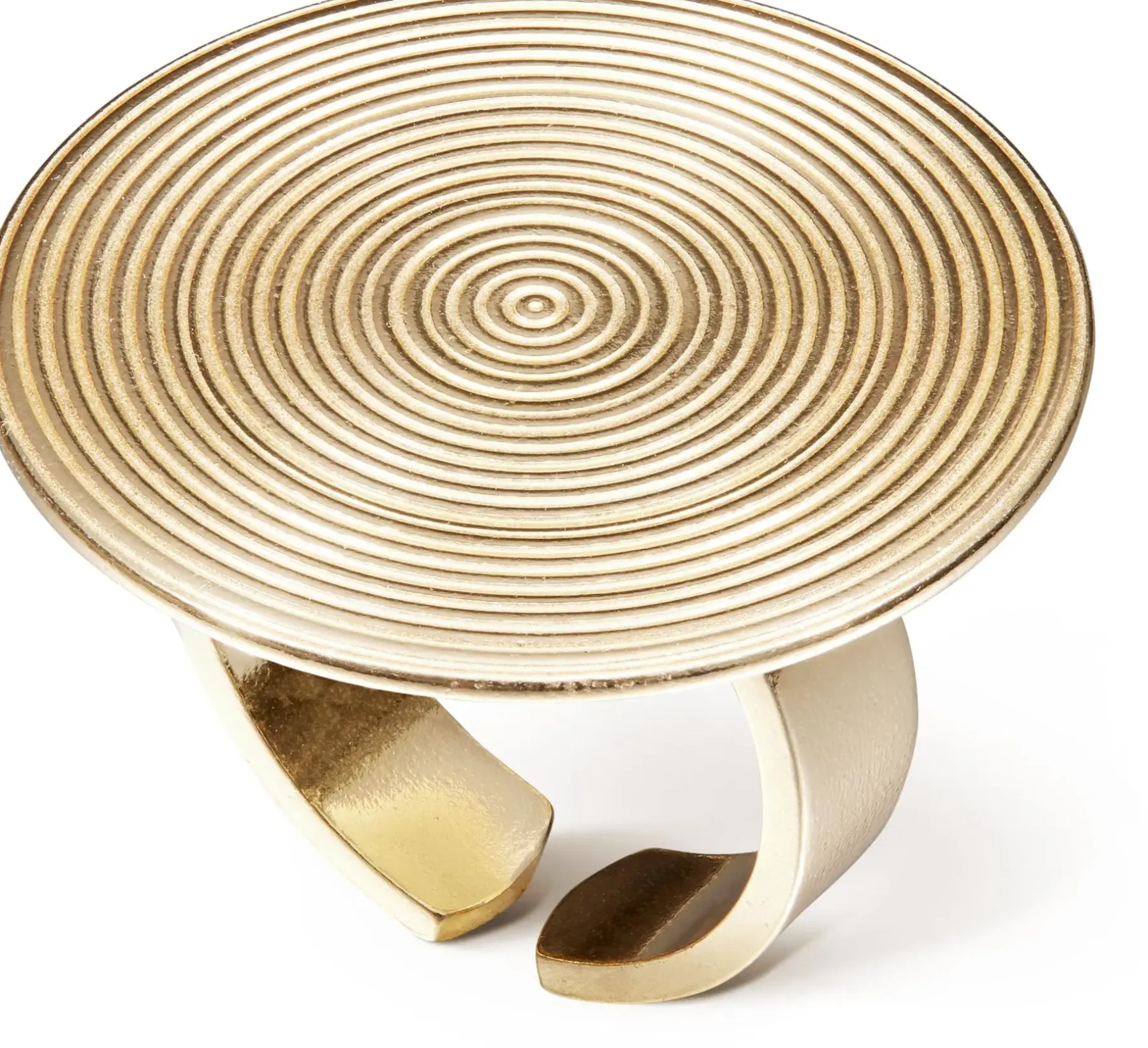 Pelkistettyyn sormusrunkoon kiinnitetty kullanhohtoinen pronssikiekko loistaa kuin aurinko. Kosmos-sormusta voit käyttää muiden Kosmos-korujen kanssa tai yksinään asukokonaisuutesi näyttävänä katseenvangitsijana. Avointa sormusrunkoa avartamalla tai supistamalla voit säätää sormuksen juuri sinun sormeesi sopivaksi. Ethän kuitenkaan taivuttele sormusta edestakaisin – toistuvasta auki-kiinni -liikkeestä sormuksen runko väsyy ja voi lopulta katketa. Koruosan leveys 30 mm, sormuksen halkaisija 17 mm. Suunnittelija Antonio Mazzamauro.
