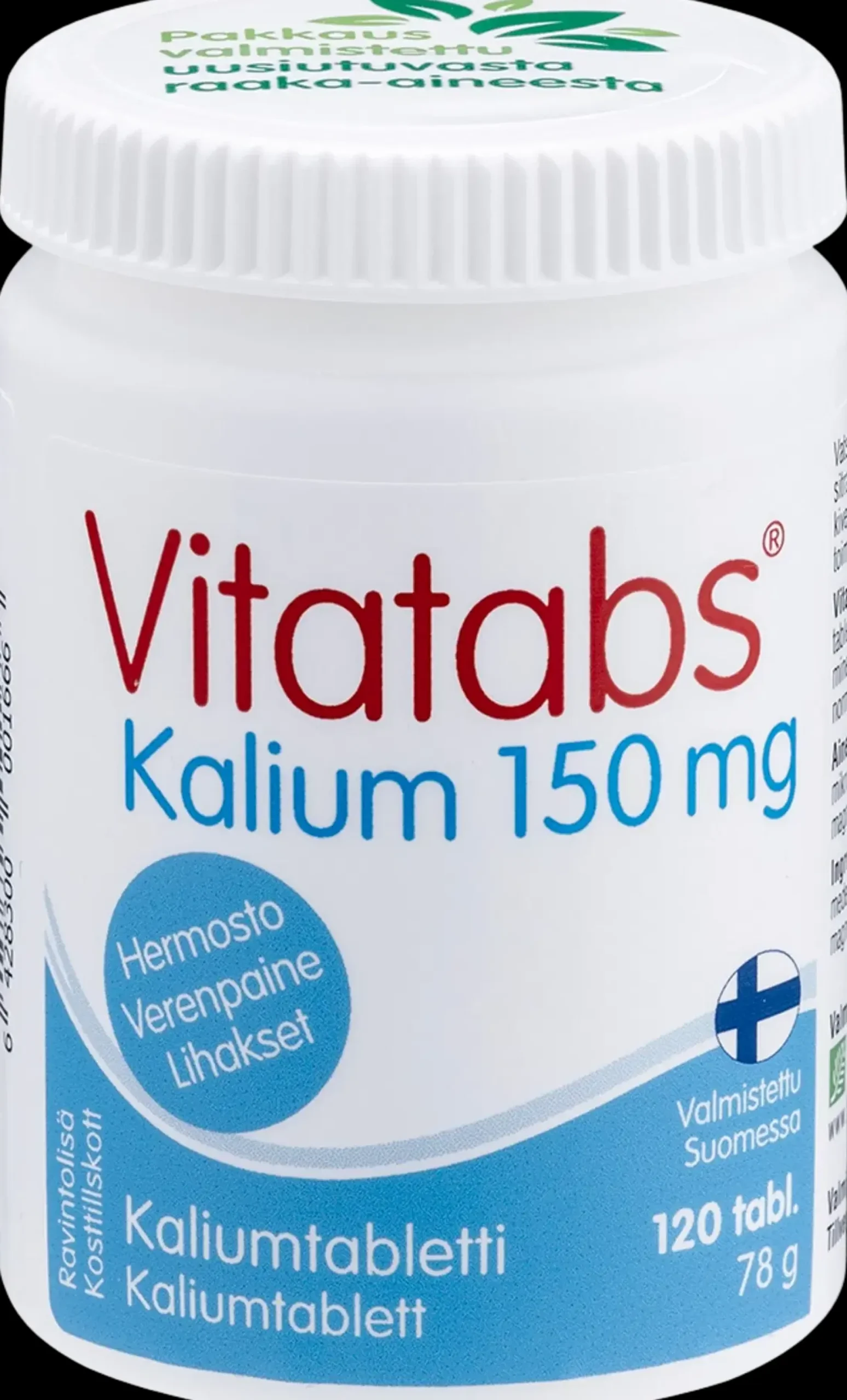 Vatsaystävällinen Vitatabs Kalium sisältää kaliumia sitraattimuodossa 150 mg/tabletti. Kalium on tärkeä kivennäisaine, joka edistää hermoston ja lihasten normaalia toimintaa sekä verenpaineen pysymistä normaalina. Annostus: 1 tabletti enintään 4 kertaa päivässä. Laktoositon, hiivaton, makeuttamaton, gluteeniton. Ei sisällä eläinperäisiä ainesosia. Valmistettu Suomessa.