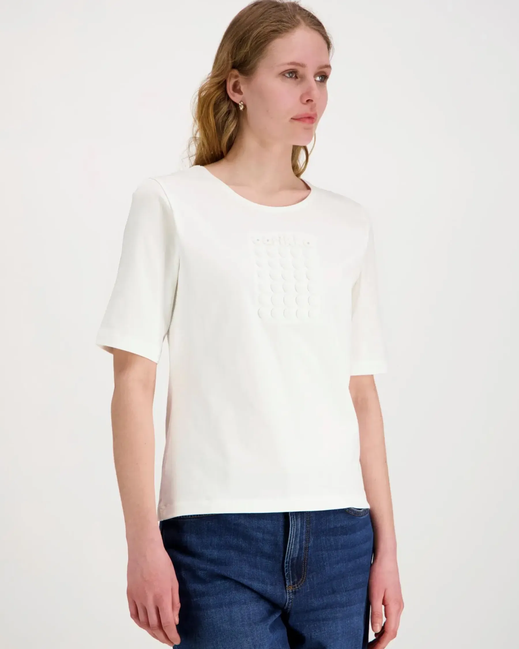 Lyhythihainen T-paita, jonka etuosaa koristaa kohokuvioitu printti. Kiki-paidassa on normaali istuvuus ja sen materiaali on pehmeää Supima-puuvillaa. Pituus olkapäästä helmaan on 60 cm koossa S. Suunniteltu Suomessa.