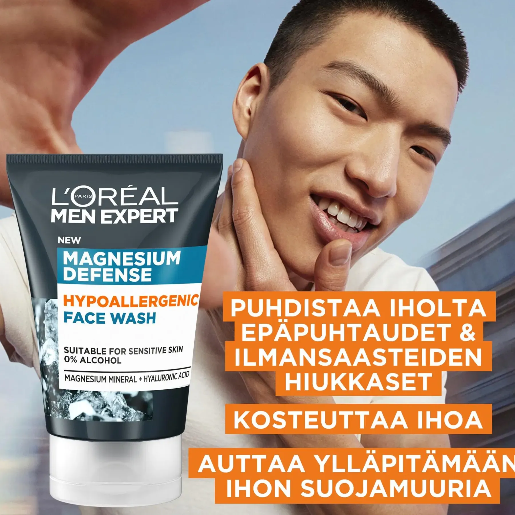 Magnesium Defense hypoallergeeninen puhdistusgeeli miesten herkälle iholle. Koostumus sisältää magnesiumineraalia, joka tunnetaan ihoa suojaavista ominaisuuksistaan ja hyaluronihappoa antamaan iholle kosteutusta.
