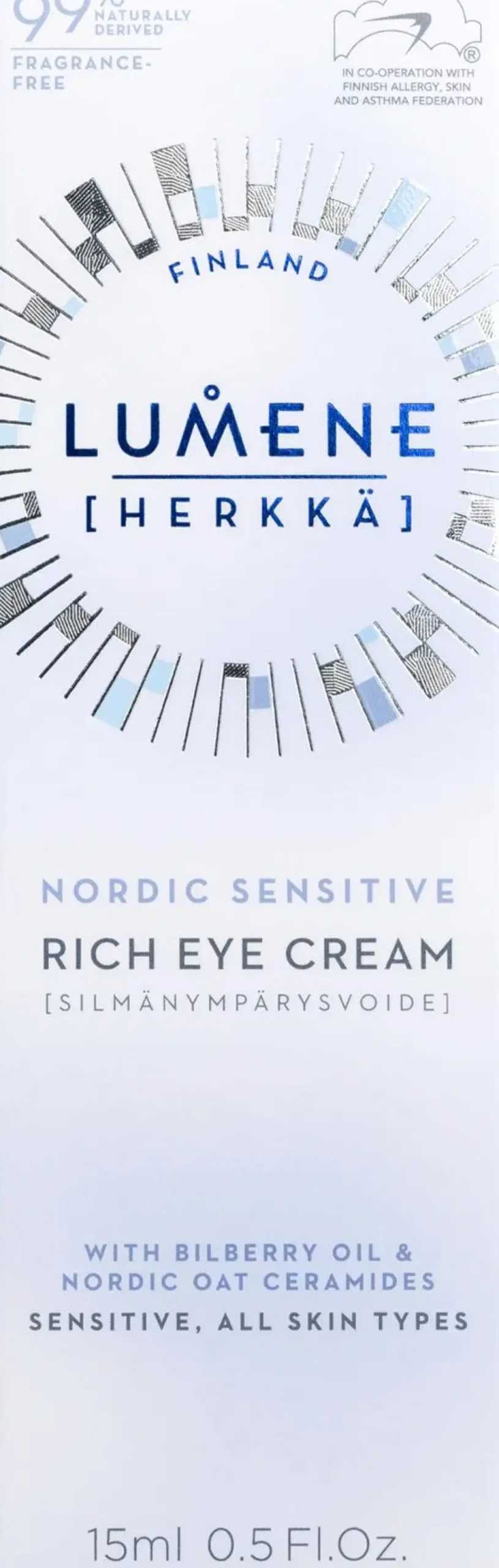 LUMENE Nordic Sensitive [Herkkä] Rauhoittava & ravitseva silmänympärysvoide on keramideilla tehostettu voide kaikille herkille ihotyypeille. Hyödyntämällä ihon suojakerrosta tukevaa pohjoista kaurakeramidia ja rauhoittavaa mustikkaöljyä, tämä riittoisa koostumus rauhoittaa välittömästi, sitoo kosteuden ja vahvistaa ihon suojakerrosta vähentääkseen ihon herkkyyttä. Helli silmänympärysihoasi rauhoittaen ja hoivaten, saaden aikaan hyvinvoivan näköisen ihon.