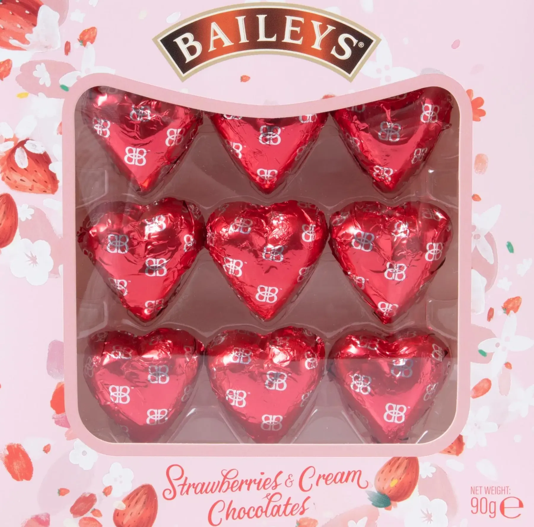 Sydämenmuotoiset suklaakonvehdit, joissa maistuu tuore mansikka ja vanilja, ripauksella Baileys kermalikööriä
