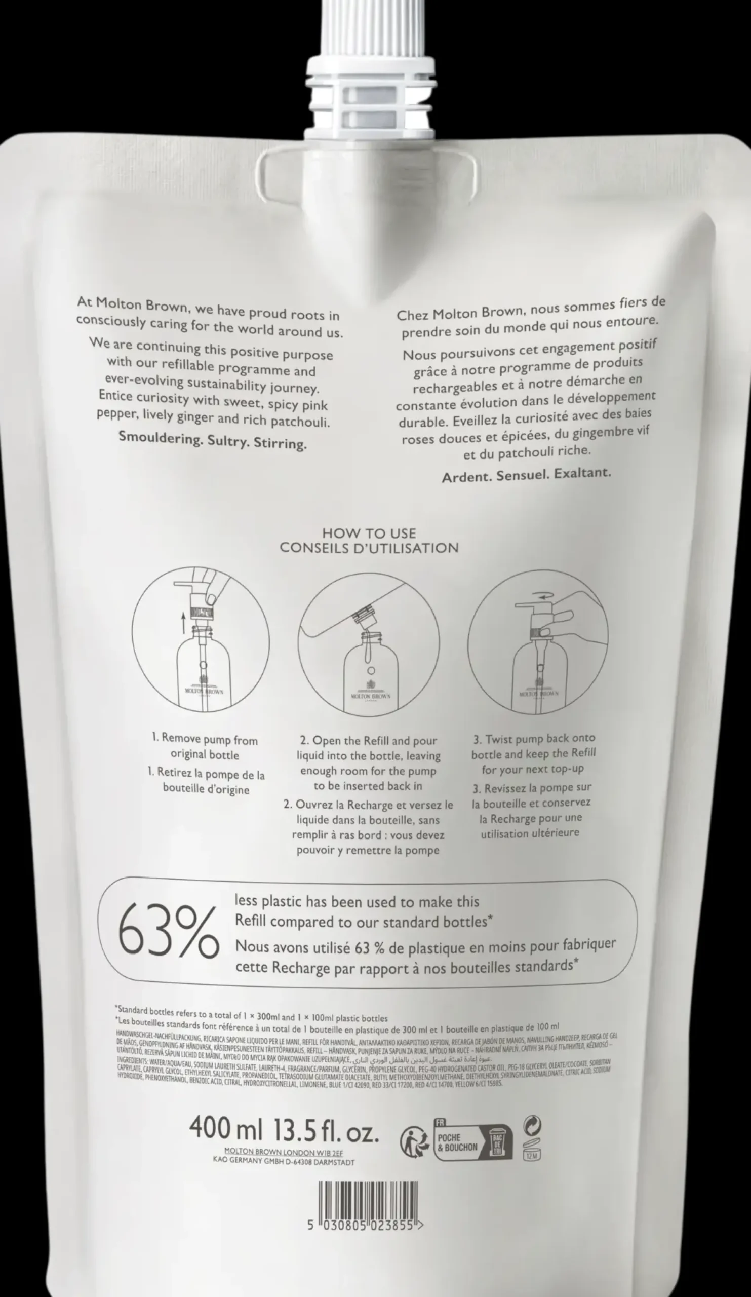 Molton Brown Fiery Pink Pepper Fine käsisaippua -uudelleentäyttöpakkauksella täytät Molton Brown -muovi- tai lasipullosi uudelleen. Virkistävä ja kosteuttava käsisaippua antaa ylellisen ja miellyttävän puhdistavan elämyksen. Sisältää mausteisen roseepippurin, lämpimän inkiväärin ja täyteläisen patsulin nuotteja. Käytä yhdessä yhteensopivan Molton Brown -käsiemulsion kanssa vahvistaaksesi puuvivahteista ja mausteista tuoksua. Uudelleentäyttöpakkaus sisältää 63 % vähemmän muovia kuin tavalliset Molton Brown -pullot.