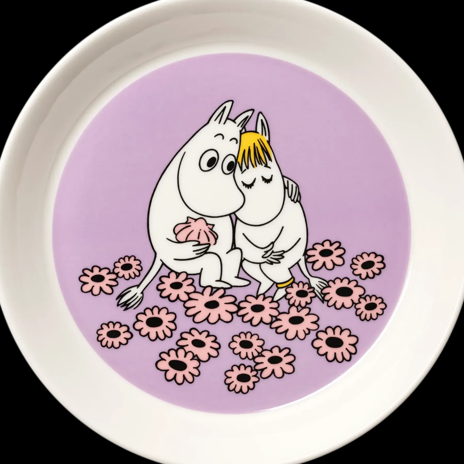 Sydänkäpyset-kulhon kuvitus kuvaa Muumipeikon ja Niiskuneidin hauskaa ja hellyttävää suhdetta. Leikkikaverit ja sydänkäpyset Muumipeikko ja Niiskuneiti muistuttavat meitä siitä, että vaikka emme ole täydellisiä, olemme aina parempia yhdessä. Moomin Arabia lautanen 19cm, Sydänkäpyset