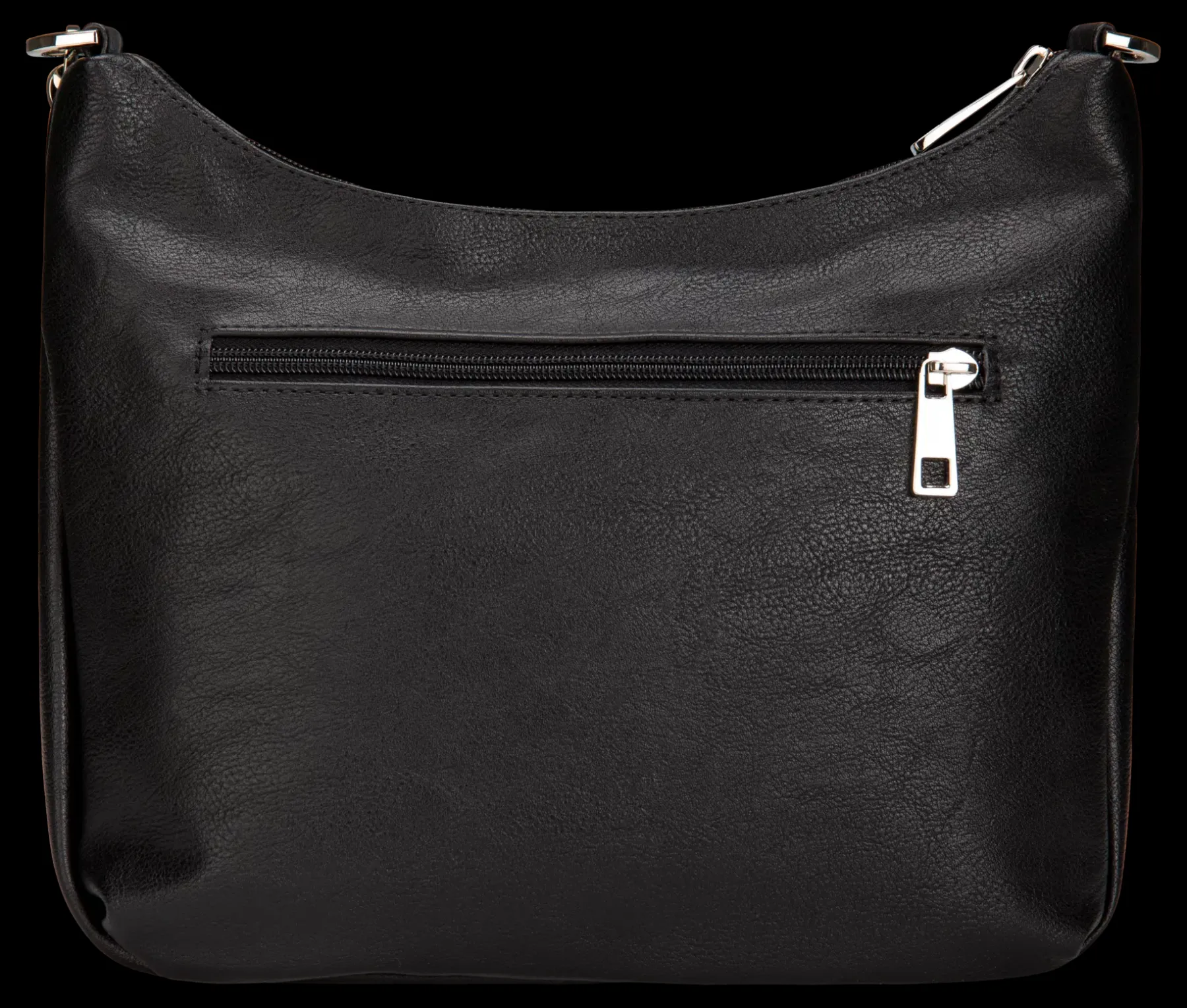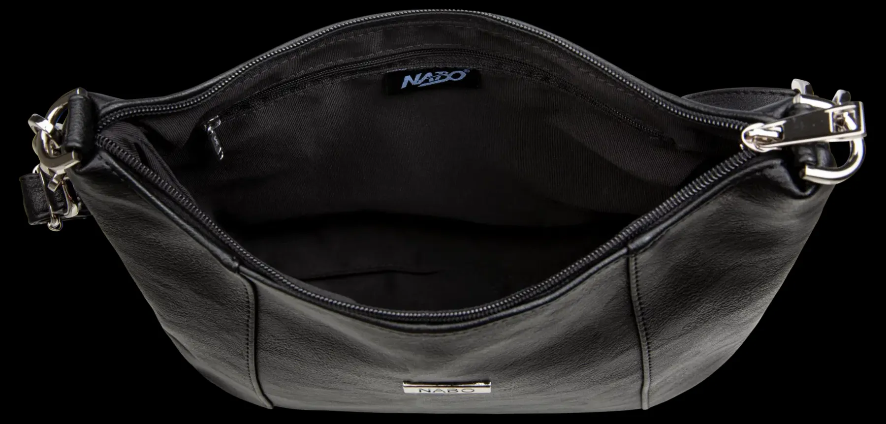 Olkalaukku keinonhasta. Näyttävyyttä antavat metalliset ketjut olkahihnan kiinnityksissä. Takana on vetoketjutasku. Sisällä on vetoketjutasku ja 2-osainen avotasku. Säädettävä hihna on 130 cm. Mitat ovat 29 x 24 x 11 cm.Edessä on metallinen Nabo-merkki. Nabo on Nokian Nahkatuote Oy:n tuotemerkki.