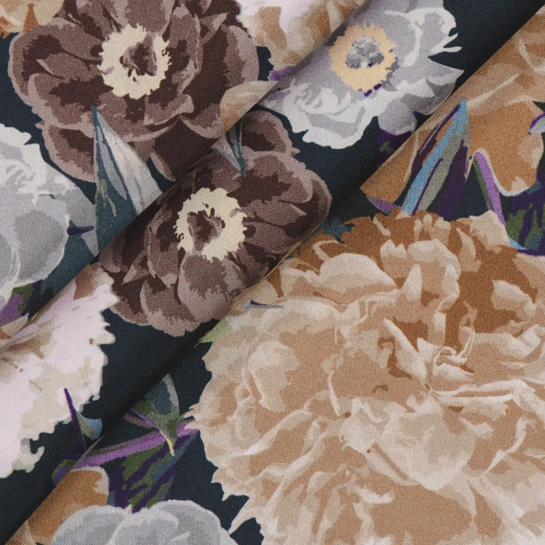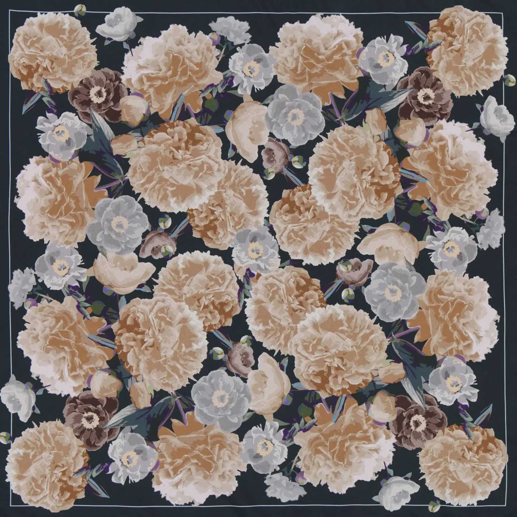 Ylellinen Italiassa valmistettu silkkihuivi jonka voi solmia monella eri tavalla. Runsas näyttävä kukkakuosi. Koko 70×70 cm.