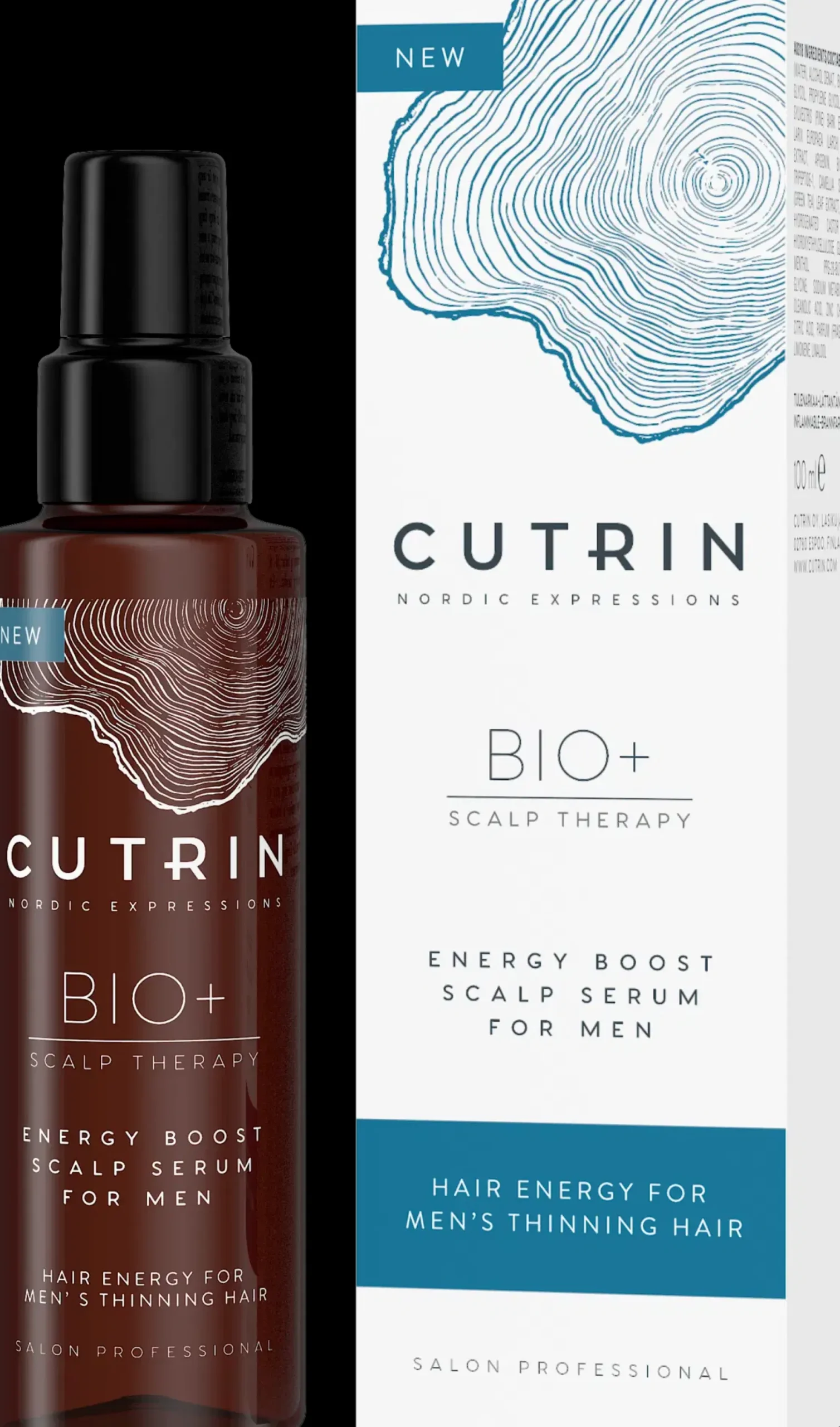 CUTRIN BIO+ vahvistava hiuspohjaseerumi. Ennenaikaisesta hiustenlähdöstä kärsiville miehille. Virkistää ja auttaa tukemaan hiusten kasvua. CUTRIN Recharge Energy -teknologia yhdistää luonnollisen pohjoismaisen männynkaarnauutteen voimakkaat antioksidantit sekä hiusten vahvuutta tukevat Procapil™ ja Redensyl™ aktiiviaineet.