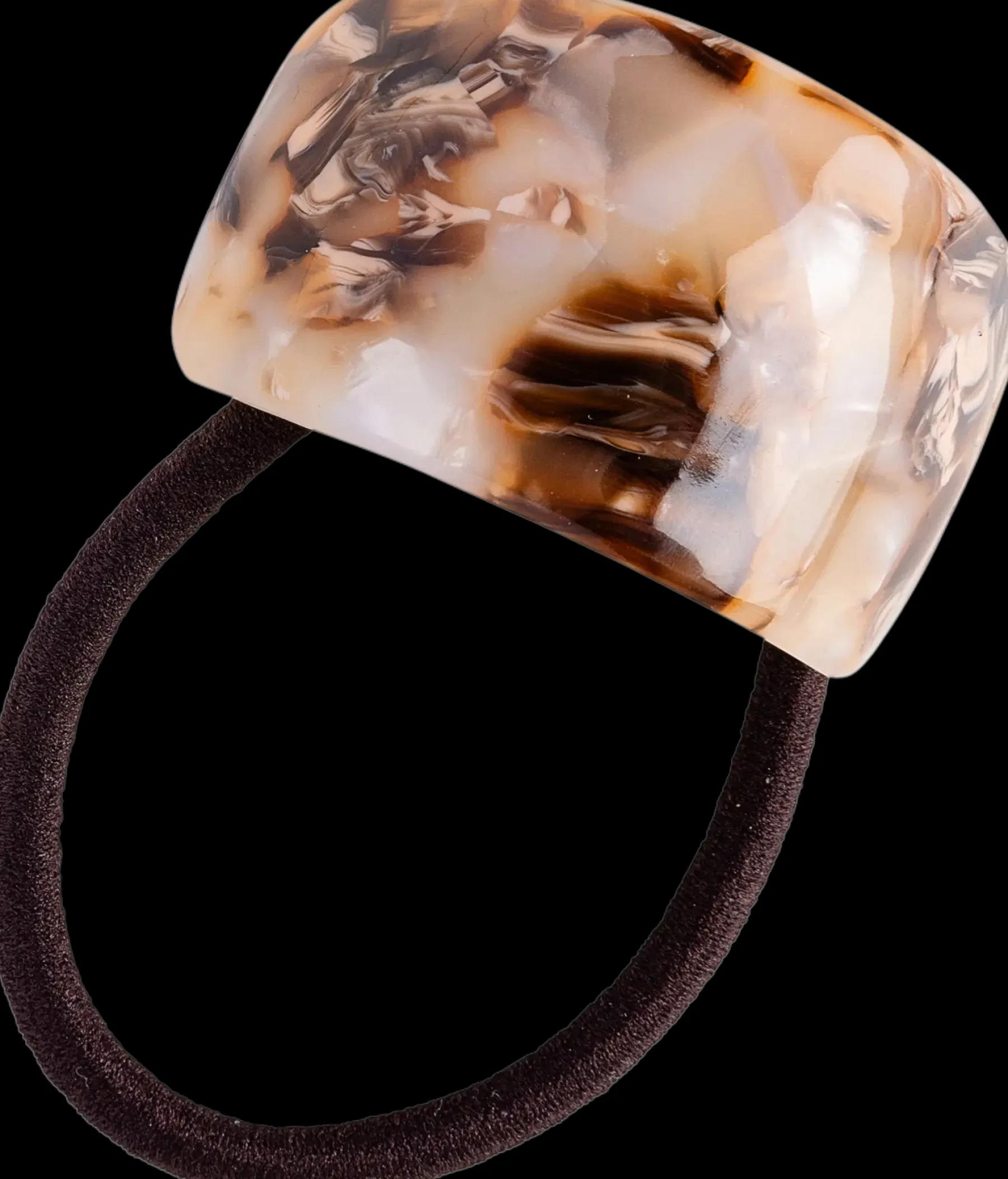 Ruskea hiuslenkki ruskeansävyisellä marmoroidulla koristeella. Koristeen leveys noin 4,5 cm.