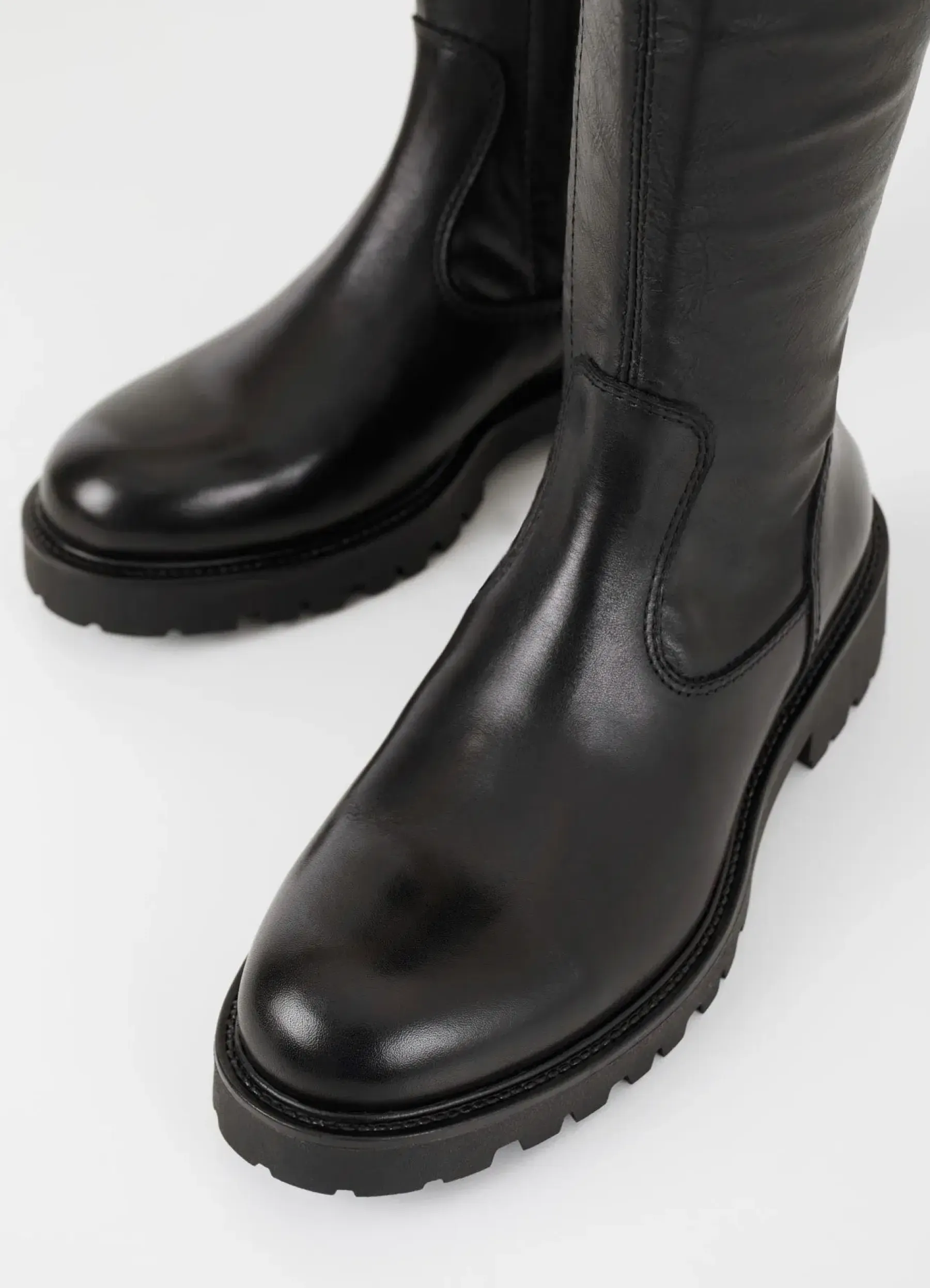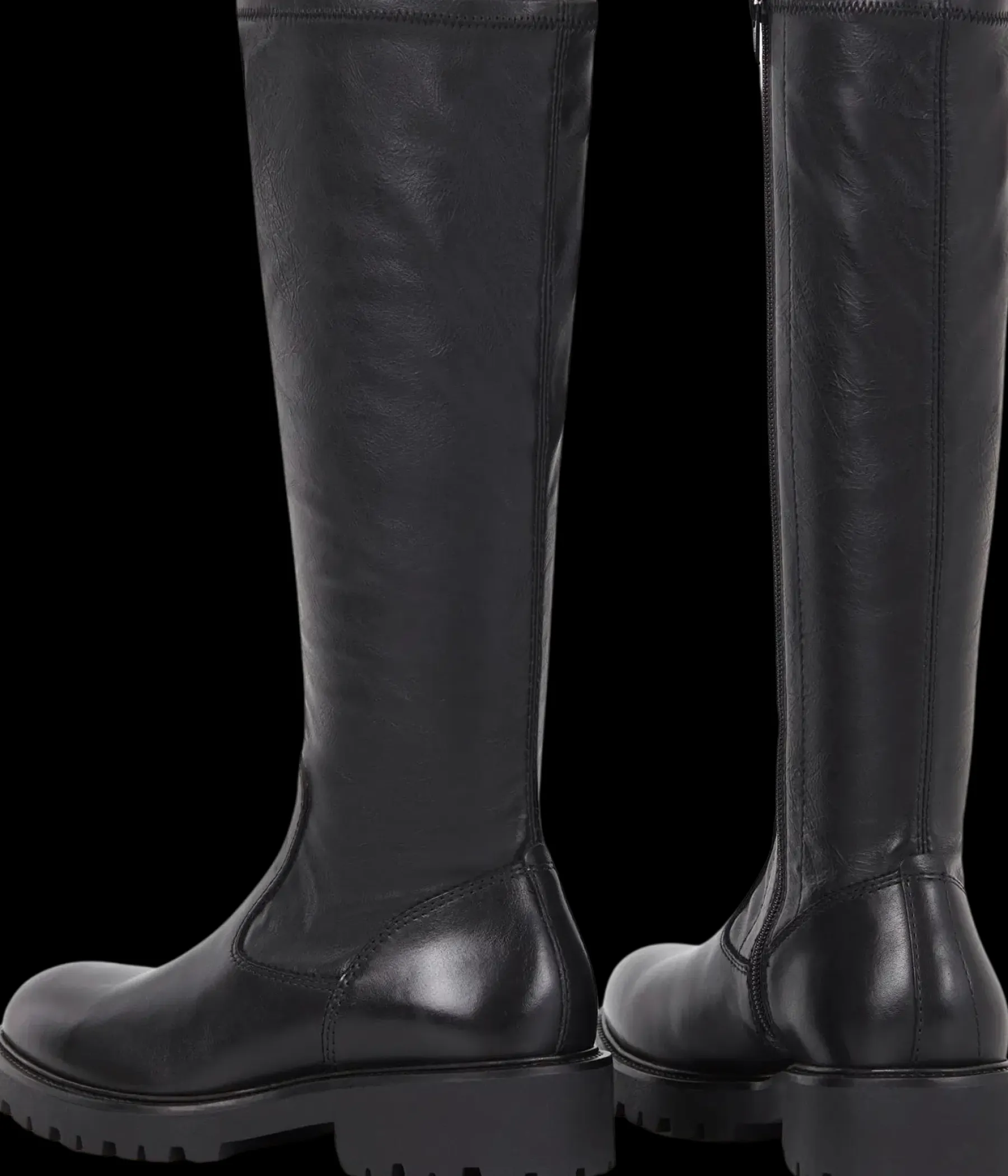 Ajattomat Kenova-saapikkaat on valmistettu yhdistelmästä mustaa nahkaa ja synteettistä nahkaa. Saappaissa on pyöreät kärjet, vetoketju ja joustava varsi. Vankat korot ovat 4cm.