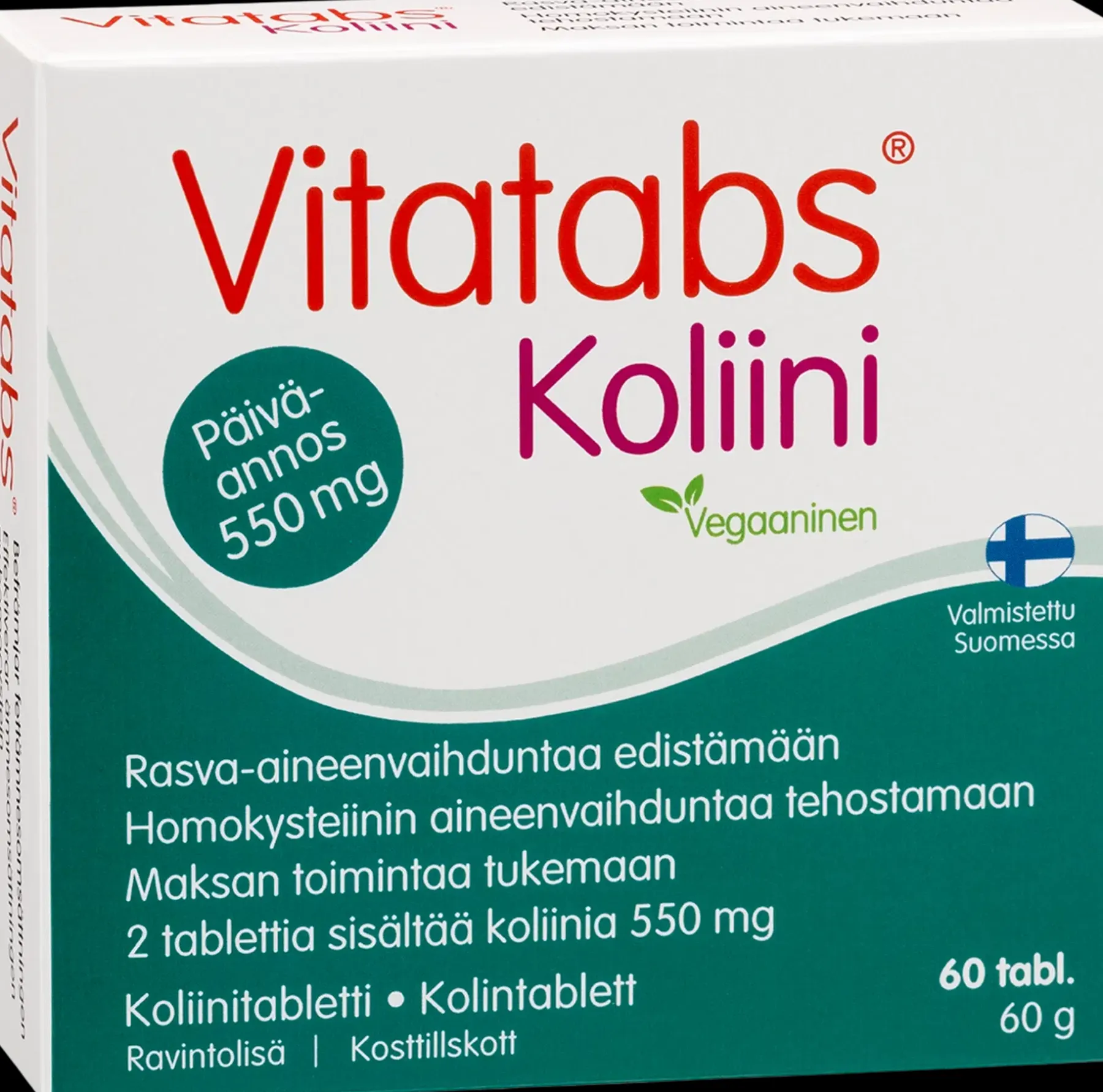 Vitatabs Koliini -tabletit sisältävät VitaCholine koliinia 550 mg päiväannoksessa. Koliini on rasvaliukoinen vitamiinin kaltainen yhdiste, jota on elimistömme kaikissa kudoksissa solukalvojen fosfolipideissä. Koliini auttaa ylläpitämään aineenvaihduntaa solutasolla: se edistää normaalia rasva-aineenvaihduntaa ja homokysteiinin aineenvaihduntaa. Koliini myös edistää maksan toiminnan pysymistä normaalina, sillä se osallistuu rasvan varastoinnin säätelyyn maksassa. Vitatabs® Koliini -ravintolisä ei sisällä eläinperäisiä ainesosia. Annostus 1 tabletti 2 kertaa päivässä. Laktoositon, hiivaton, makeuttamaton, gluteeniton. Valmistettu Suomessa.