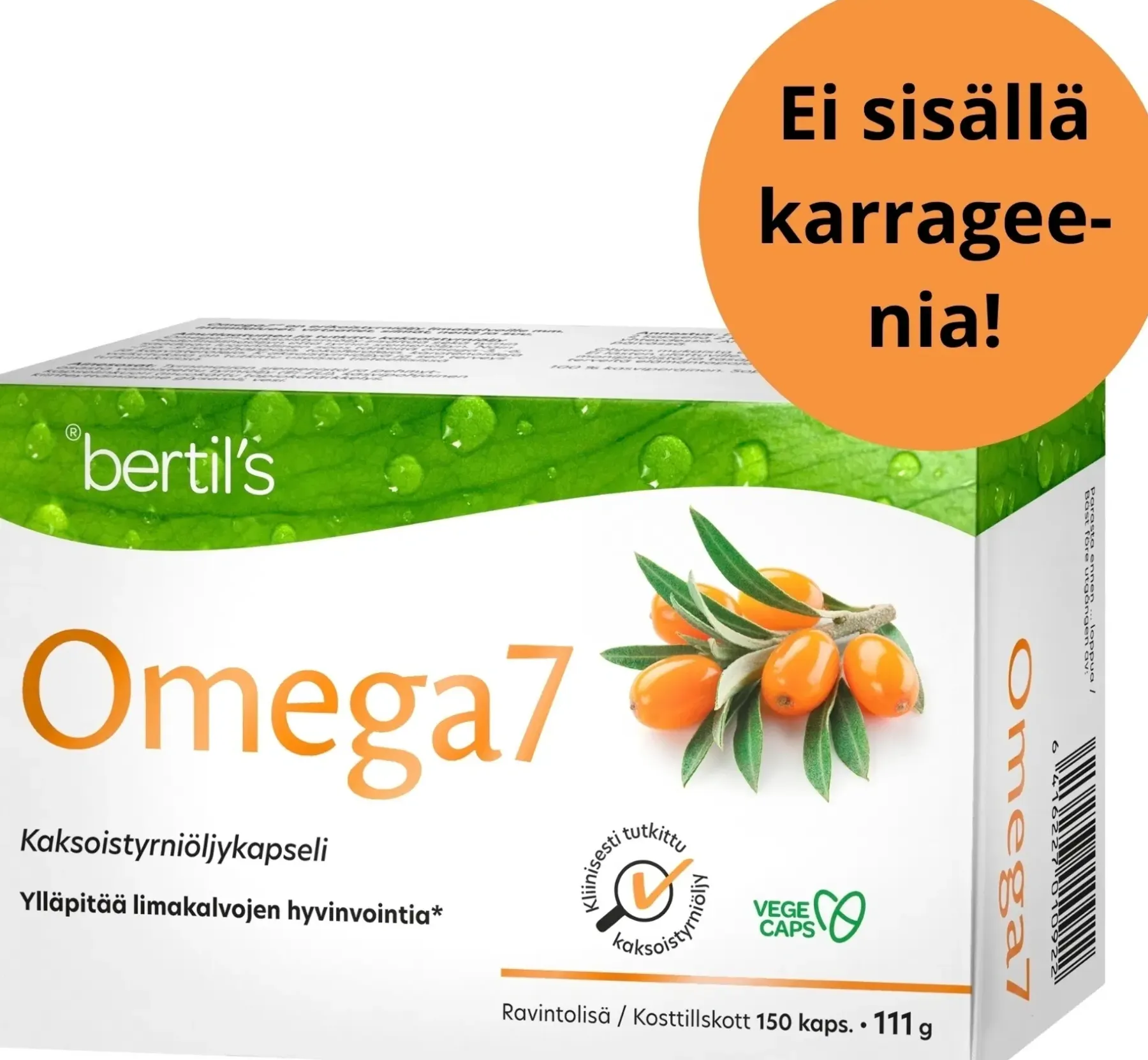 Terveet limakalvot ja iho ovat monin tavoin olennaiset elimistön hyvinvoinnin kannalta. Korkealaatuiset Omega7 Kaksoistyrniöljykapselit tukevat limakalvojen ja ihon hyvinvointia sisältämiensä rasvahappojen, kasvisteroleiden ja antioksidanttien avulla. Tuotteen sisältämä erityislaatuinen kaksoistyrniöljy tarjoaa täyden hyödyn tyrnimarjan poikkeuksellisista ravitsemuksellisista ominaisuuksista, sillä se sisältää molemmat tyrnimarjan sisältämät öljyt – sekä tyrnimarjan hedelmälihan että siementen öljyn.