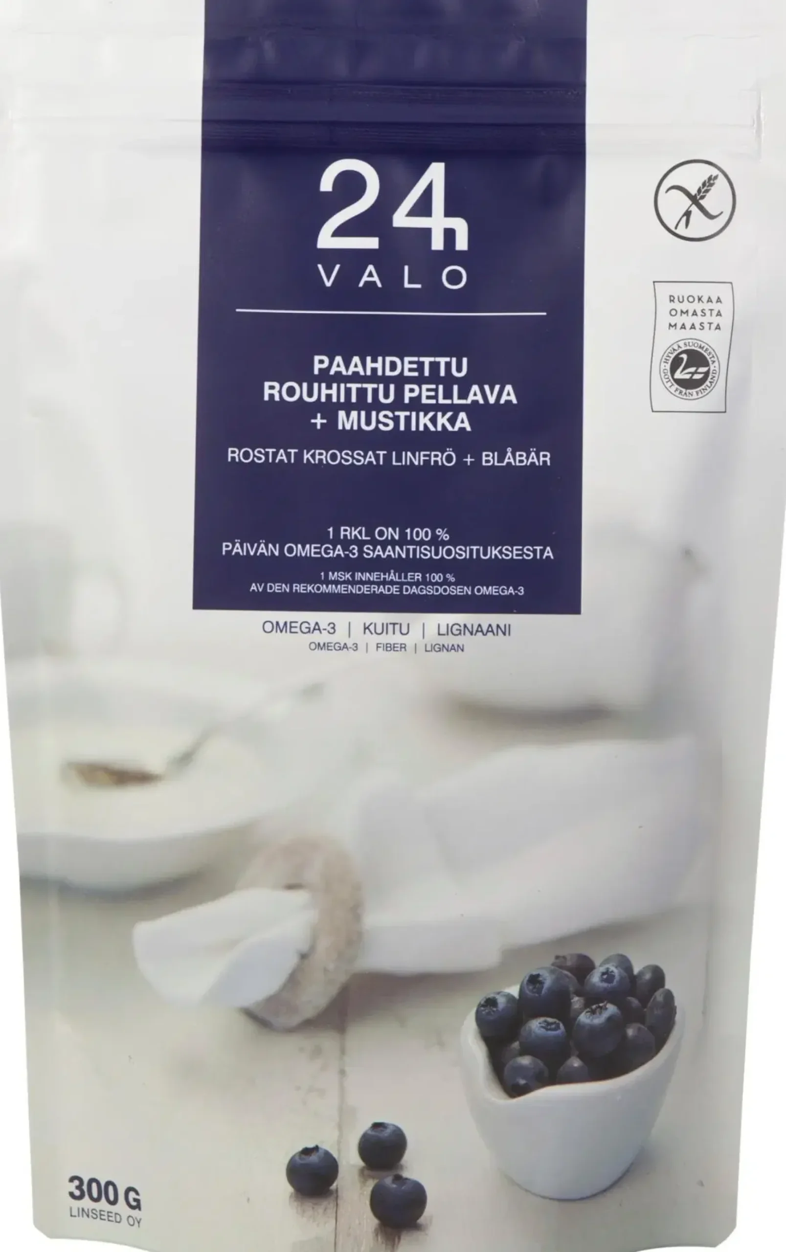 VALO24h:n pellava kasvaa Suomessa, maailman pohjoisimmalla pellavanviljelyalueella. Kotimainen gluteeniton pellava sopii käytettäväksi sellaisenaan jogurttiin, rahkaan, smoothieen, puuroon, salaattiin tai keittoon. Valo24h-tuotteissa on koko pellavansiemen rouhittuna, joten jo 1 rkl:n päiväannos tarjoaa päivän omega-3-rasvahapot, runsaasti kuitua, magnesiumia, proteiinia ja lignaania. Paahto antaa pellavalle herkullisen pähkinäisen maun, jota mustikka loistavasti täydentää. Rouhinnan ansiosta ravintoaineet imeytyvät helposti elimistön käyttöön. Sopii vähähiilihydraattiseen ruokavalioon, keliaakikoille ja vegaaneille. Tämä tuote voitti Elintarviketeollisuusliiton vuoden 2012 Tähtituote-kilpailun!