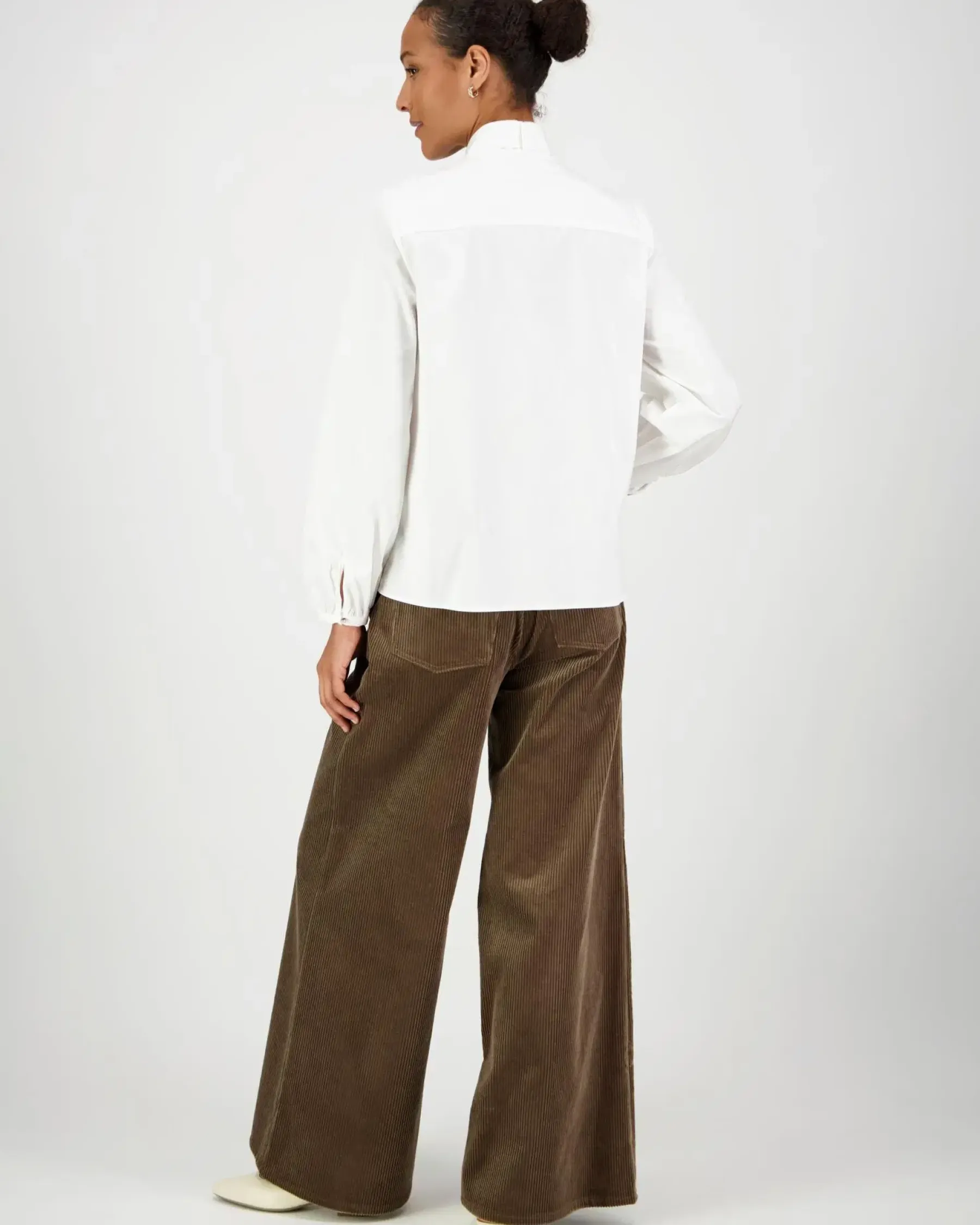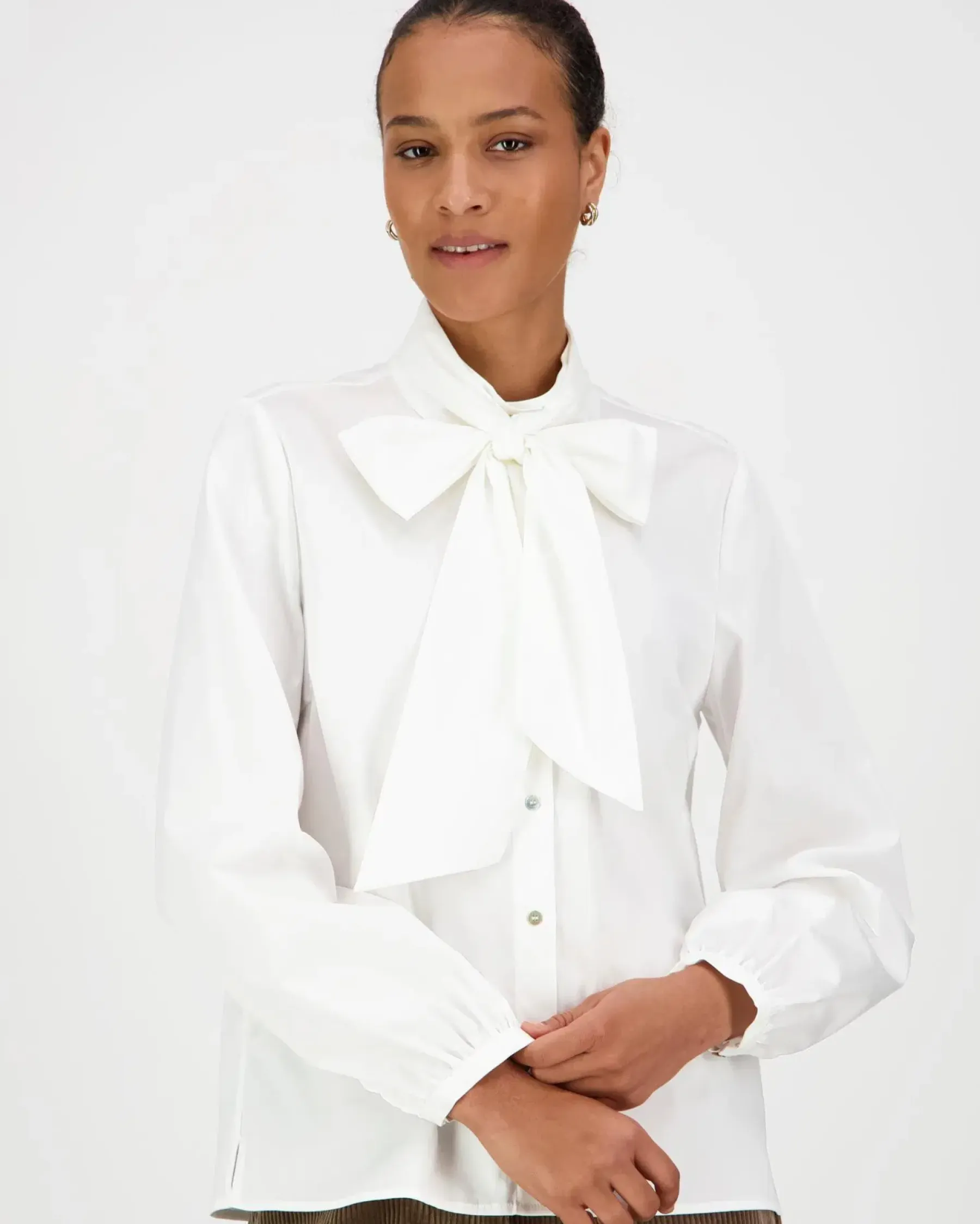 Pitkähihainen korkeakauluksinen paitapusero, jonka kaulassa irrotettava rusetti. Paitapuseron hihat ovat kauniisti laskostetut ja sen sivussa on pienet halkiot. Edessä napitus.