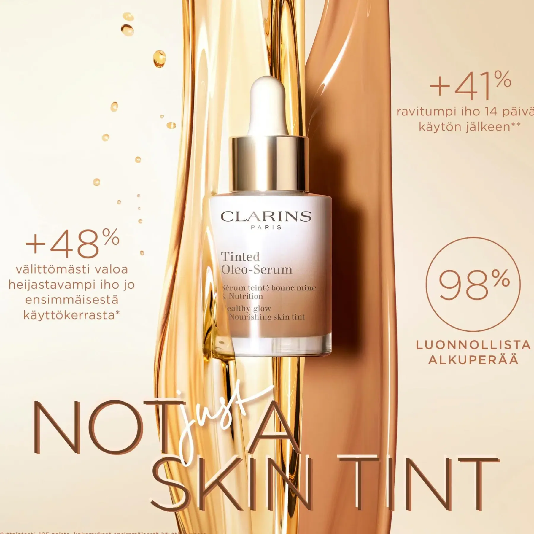 Clarins Tinted Oleo-Serum on sävyllinen öljyseerumi, joka yhdistää ihonhoidon ja meikin. Se ravitsee ja luo iholle nuorekkaan, heleän lopputuloksen. Tuotteen kevyt, seerumimainen koostumus sulautuu ihoon luonnollisesti tehden ihosta raikkaan ja tasaisen. Hasselpähkinäöljy, luomulaatuinen jojobaöljy, kasviperäinen skvalaani ja keramidit yhdessä hoitavat ihoa. Kerrostettavan koostumuksen ansiosta sävyvoiteen peittävyys on säädeltävissä. Ihanteellinen normaalille ja kuivalle iholle. Luonnollinen koostumus sisältää runsaasti ihoa hoitavia raaka-aineita ja sen koostumuksesta 98 % on luonnollista alkuperää.