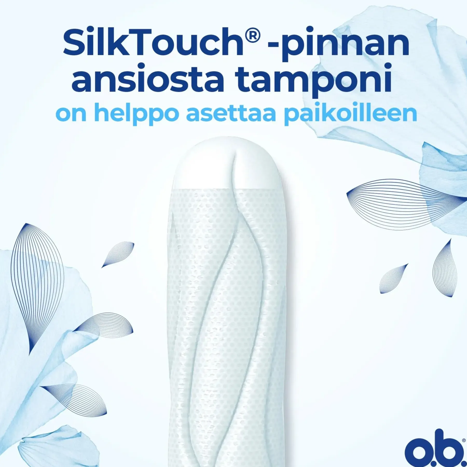 HELPPO LAITTAA PAIKALLEEN: 1. Pese kädet. Poista tamponin muovikääre kääntämällä sitä. Heitä kääre roskiin (soveltuu muovinkeräykseen), älä huuhtele sitä vessanpöntöstä. 2. Vedä poistonaru ulos. Työnnä tamponia varovasti emättimeen ylös- ja taaksepäin. Jos vielä tunnet tamponin, koita muuttaa vartalosi/tamponin suuntaa hieman. 3. Kun tamponi on oikeassa paikassa emättimessä, et tunne sitä. Jos vielä tunnet tamponin, koita työntää sitä hieman syvemmälle. Tamponin poistonarun tulee jäädä selkeästi näkyviin, kun tamponi on paikallaan emättimessä. Pese kädet uudelleen. HELPPO POISTAA: 1. Pese kädet. Vedä poistonarusta. Heitä tamponi roskiin, älä huuhtele sitä vessanpöntöstä. 2. Mikäli tamponin poistaminen on vaikeaa, se ei välttämättä ole vielä täynnä. Siinä tapauksessa sinun kannattaa harkita ensi kerralla tamponia, jonka imukyky on pienempi.