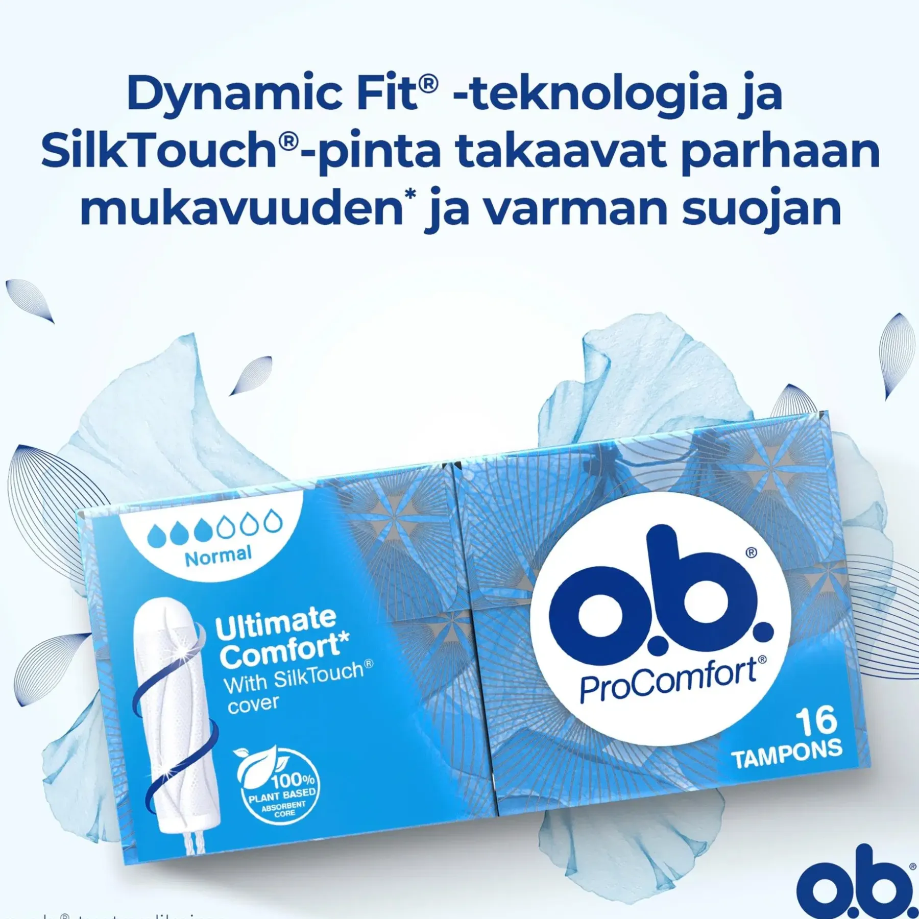Sileän SilkTouch®-pintansa ja ainutlaatuisten lomittaisten uriensa ansiosta o.b.® ProComfort® Normal -tamponi on helppo asettaa paikalleen, ja se takaa luotettavan suojan. Mukava ja helppokäyttöinen myös päivinä, jolloin vuoto on vähäistä. Jopa 100 % suoja vuotoja vastaan ja luotettava suoja 4-8 tunnin ajan. o.b.® ProComfort® on o.b.®-valikoiman mukavin tamponi, joka tarjoaa luotettavaa suojaa, jotta voit keskittyä tekemään sitä, mitä haluat. Sopii parhaiten normaaliin tai runsaaseen vuotoon.