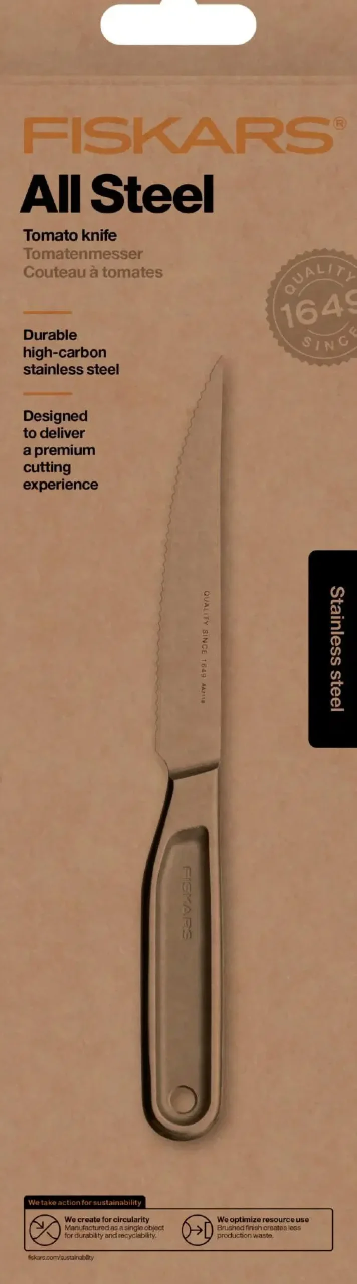 Fiskars All Steel tomaattiveitsi. Ensiluokkaisesta ruostumattomasta teräksestä valmistettu All Steel -tomaattiveitsi tarjoaa erinomaisen suorituskyvyn ja kestävyyden. Sen vahva, sahalaitainen terä sopii tomaattien ja muiden ohutkuoristen ruokien leikkaamiseen.