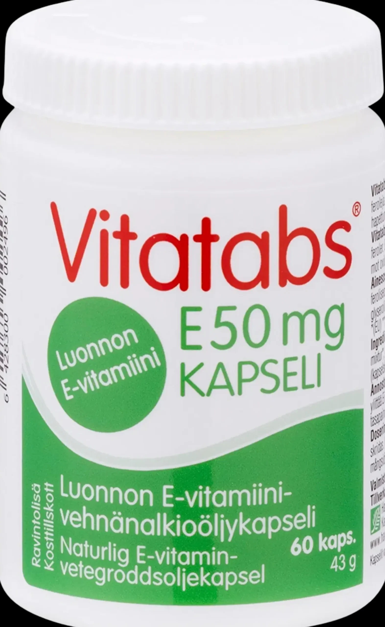 Vitatabs E 50 sisältää luontaisia E-vitamiiniyhdisteitä eli tokoferoleja, joissa on E-vitamiinia yhteensä 50 mg / kapseli. E-vitamiini on tärkeä antioksidantti, joka suojaa soluja hapettumisstressiltä antaen elimistölle elinvoimaa ja nuorekkuutta. Annostus: 1 kapseli päivässä. Laktoostion, hiivaton, makeuttamaton, gluteeniton.