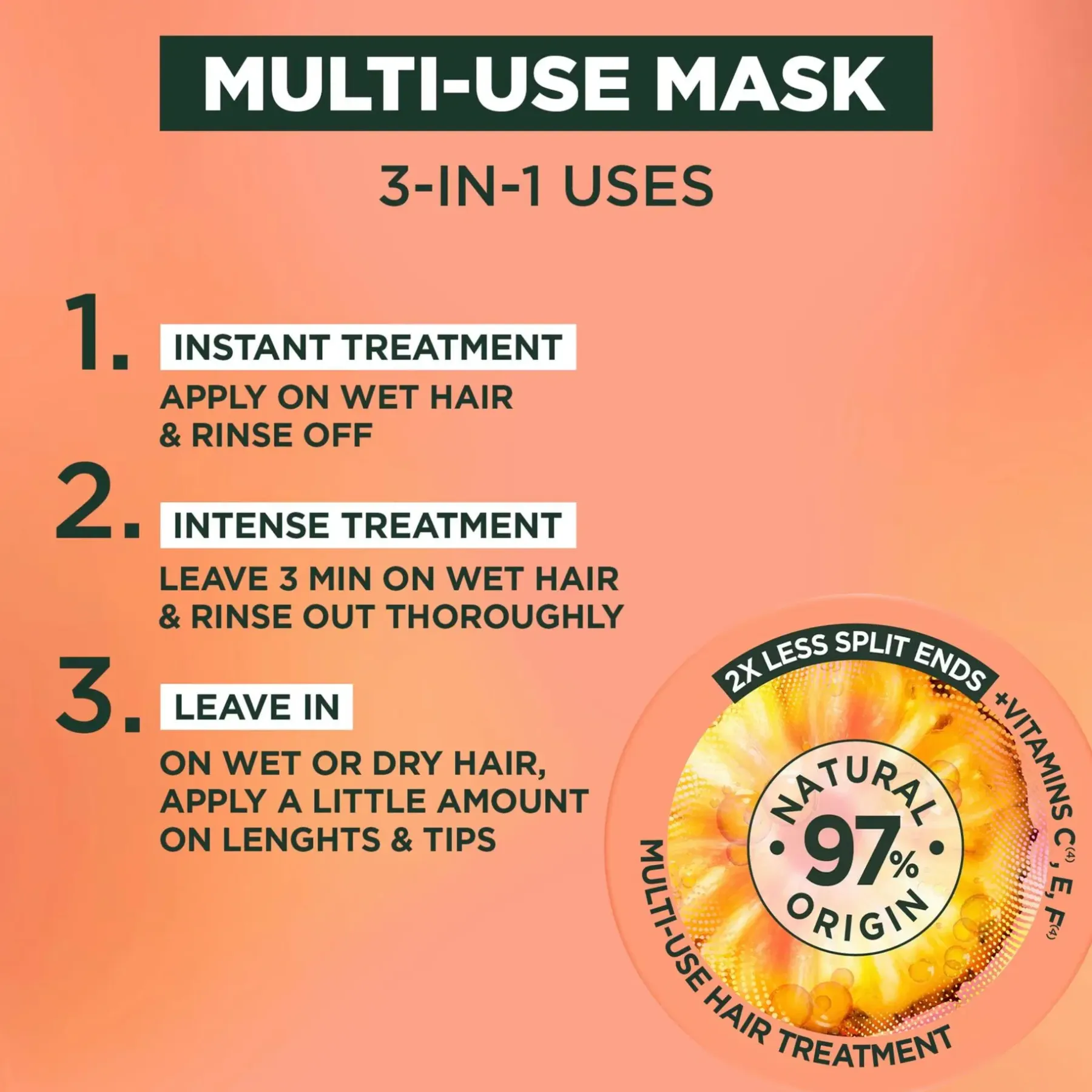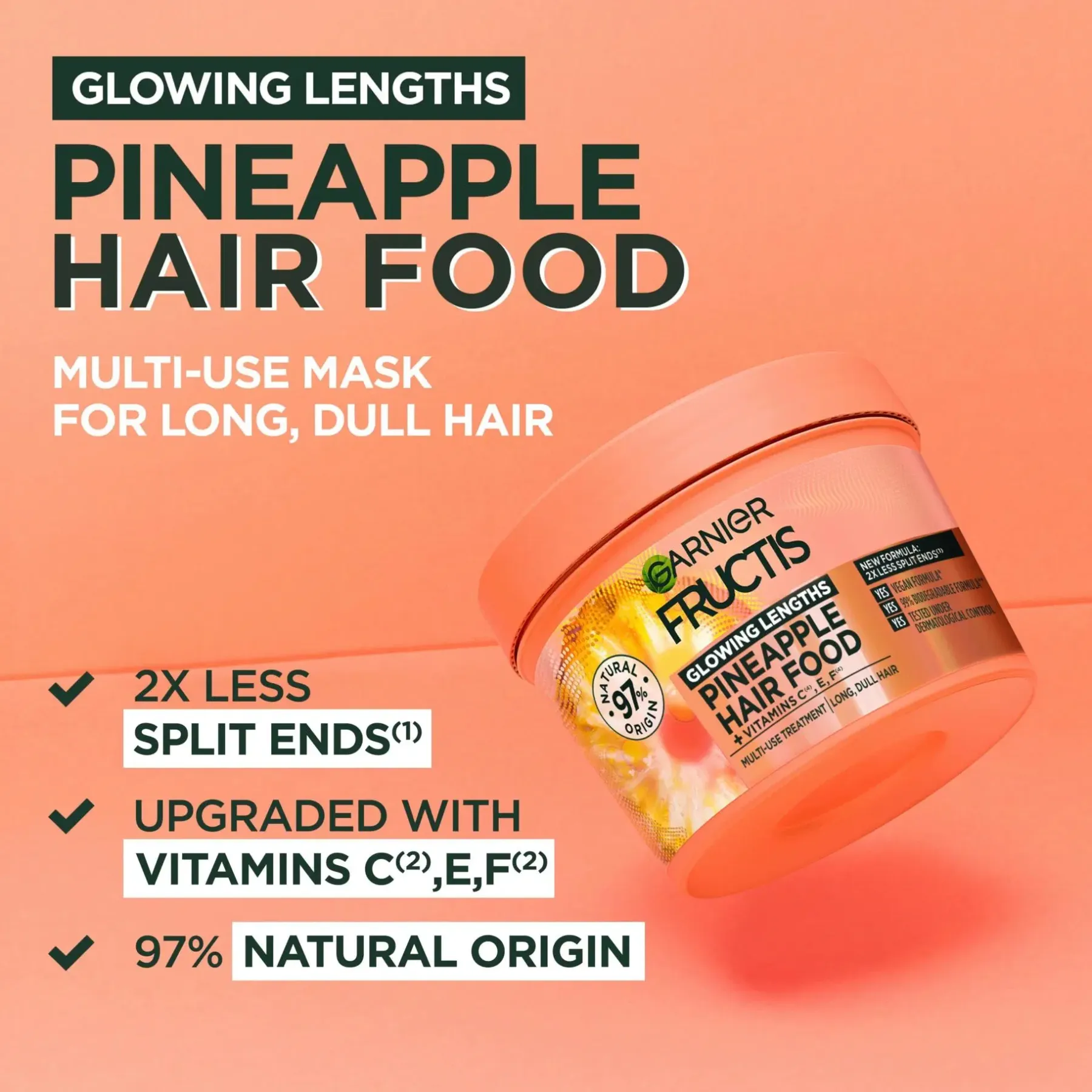 Garnier Fructis Hair Food Pineapple -hiusnaamio pitkille ja elottomilta näyttäville hiuksille antaa intensiivistä kiiltoa ja ravitsevuutta pitkille hiuksille. Hiusnaamio tekee hiuksista helpommin selvitettävät. Lopputuloksena on 2x vähemmän kaksihaaraisia*! Vegaaninen koostumus** on 97% luonnollista alkuperää ja 99% biohajoava***. Ilman silikonia luonnollisen tunteen aikaansaamiseksi. Käytä hoitoaineena, hiusnaamiona tai hiuksiin jätettävänä hoitoaineena. Garnier on virallisesti hyväksytty Cruelty Free International Leaping Bunny -ohjelmaan.