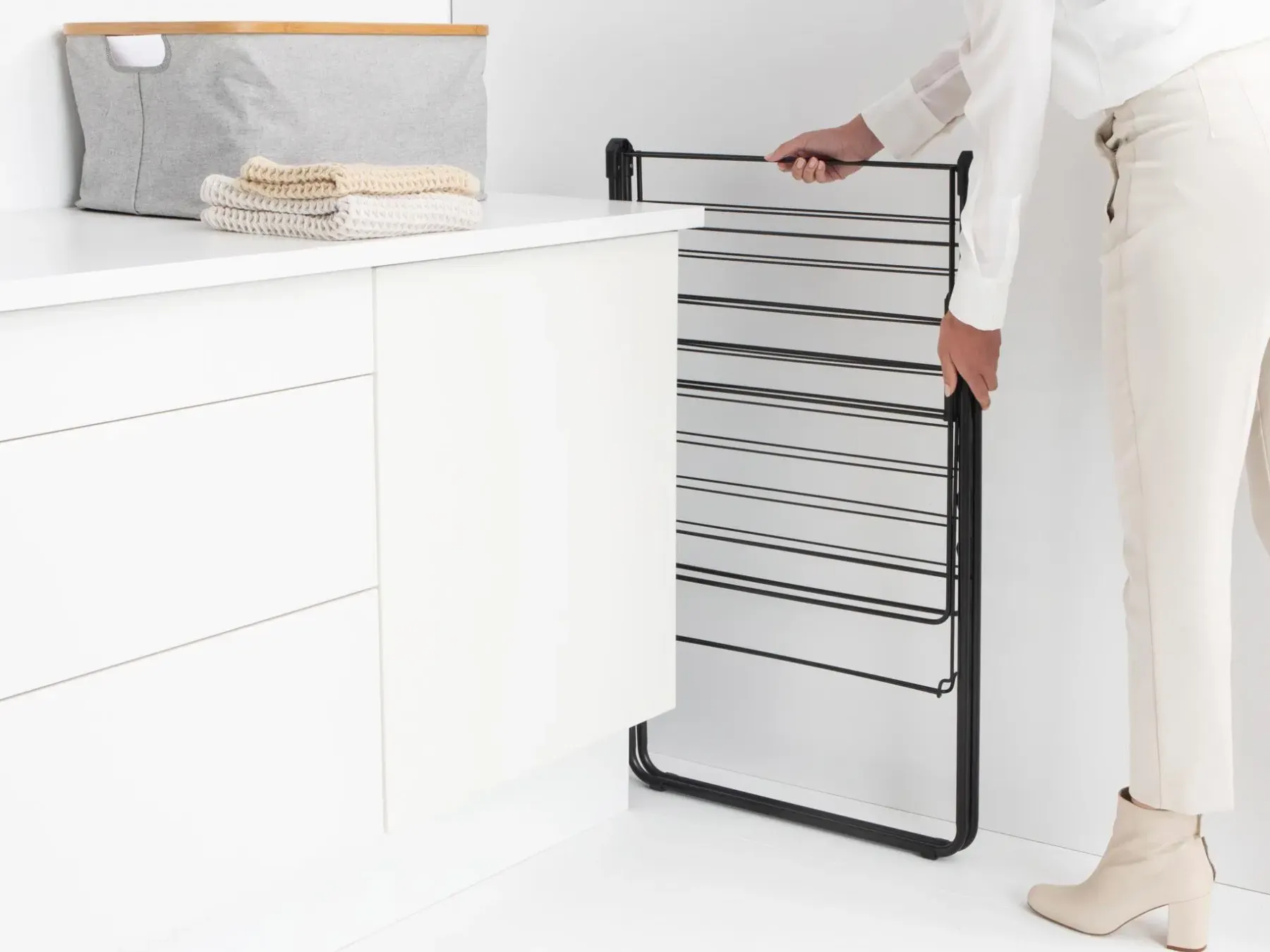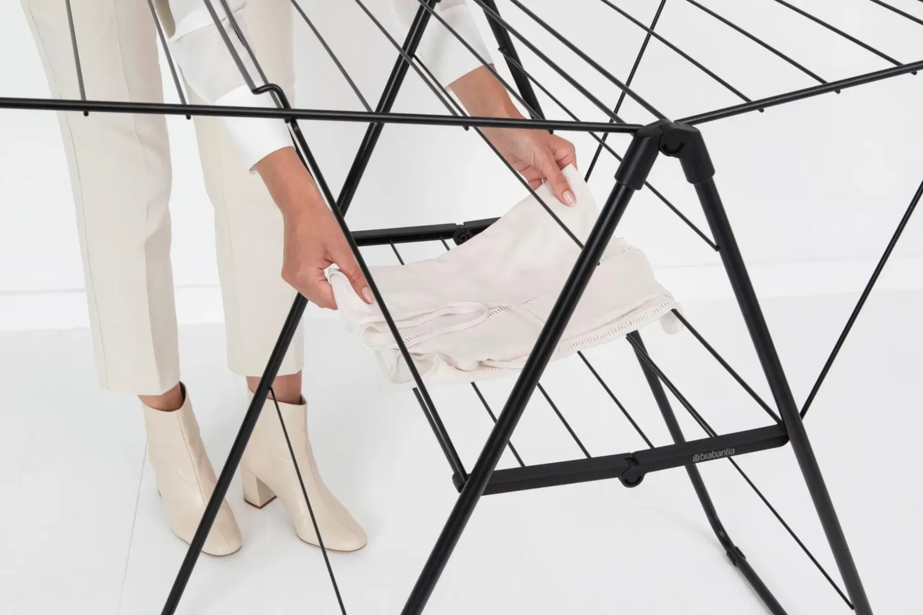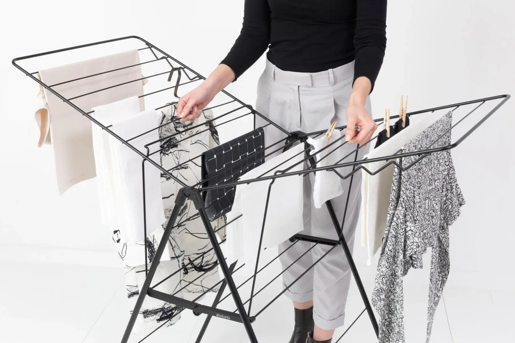 Pyykkien kuningas. Säästä aikaa ja energiaa kuivaamalla pyykit luonnollisesti – ja säästä tilaa ripustamalla ne tähän älykkääseen telineeseen! Tämän HangOn-pyykinkuivaustelineen 20 metrin joustavan kuivaustilan ja kuuden vaateripustinpaikan ansiosta voit kuivata ripustettavat housut tai tasokuivattavat herkät vaatteet missä tahansa huoneessa. Ja kun kaikki ovat kuivuneet, voit kätevästi taittaa sen kokoon varastoon. Erinomainen pyykinkuivausteline! Tilaa jopa kahdelle koneelliselle pyykkiä – 20 metriä kuivaustilaa.Pienille ja isoille pyykeille – säädettävä siivekkeiden korkeus.Säästää tilaa – kompakti kokoontaitettuna ja helppo koota.Täydellinen erikokoisille paidoille – mukana 6 koukkua ripustimille.Helppo liikuttaa myös pyykkien kanssa – sisältää kuljetuslukon.Ei yllätyksiä – lapsilukko estää tahattoman kokoontaittumisen.Sopii herkän pyykin (taso)kuivaukseen – mukana kuivaustaso.Pienempi mahdollisuus vahingoittaa lattiaa – vahvat suojukset.Ongelmaton käyttää – 5 vuoden Brabantia-takuu ja huolto.Ympäristöystävällinen – Cradle-to-Cradle® sertifikaatti, Hopea tasolla.Hyväksi myös ympäristölle – säästää energiaa ja auttaa WeForestia kasvattamaan lisää puita.Kestävämpi valinta – valmistettu 62% kierrätetyistä materiaaleista, 95% kierrätettävä.Sisäkäyttö ja rajoitettu ulkokäyttö – kestää jonkin verran auringonpaistetta, mutta ei sadetta tai syövyttäviä ympäristöjä.