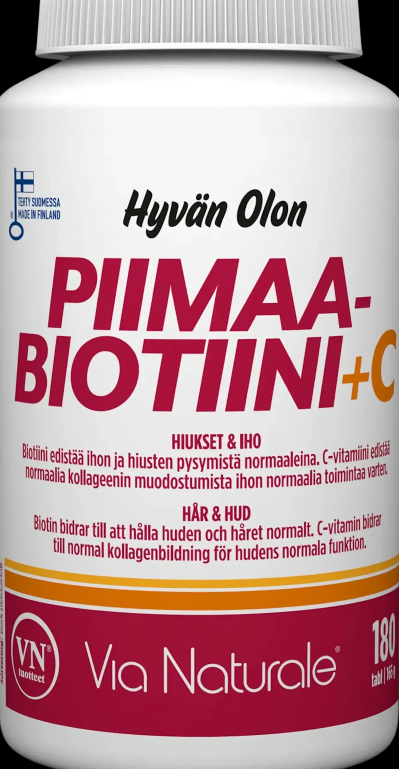 Piimaa, biotiini, C-vitamiinivalmiste, ravintolisä. Monipuolinen lisäravinne hiuksille ja iholle.. Kolmen tabletin vuorokausiannos sisältää piimaata 893 mg, joka vastaa piitä 375 mg. Biotiini: edistää hiusten, ihon ja limakalvojen pysymistä normaaleina. C-vitamiini: edistää normaalia kollageenin muodostumista ihon, verisuonien, luuston, rustojen ja ikenien normaalia toimintaa varten.
