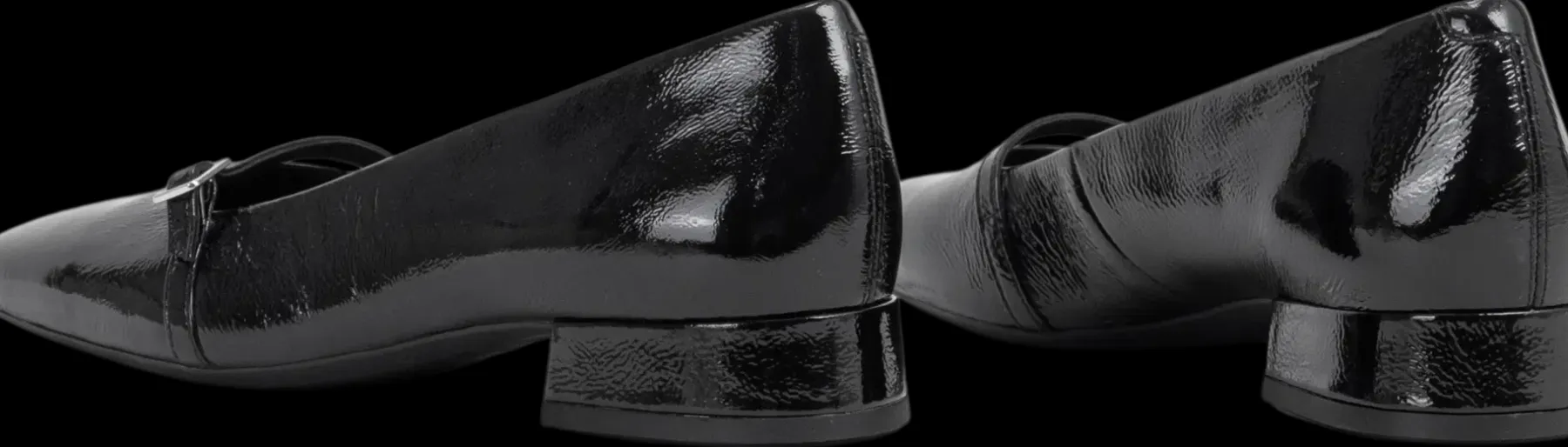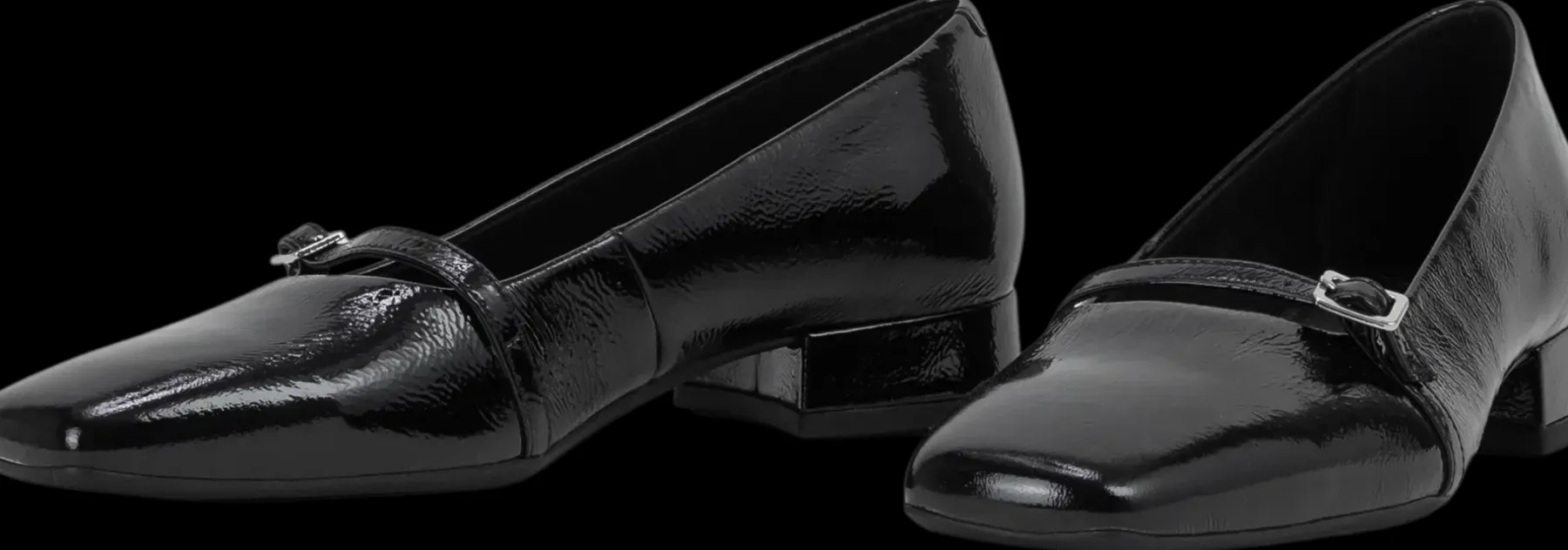 Juhlavat Debbi-avokkaat Mary Jane-yksityiskohdilla. Valmistettu mustasta patentoidusta nahasta, neliskanttiset kärjet, säädettävät remmit solkikiinnityksillä ja nahkapohjalliset. Matalat 2,5cm korot.