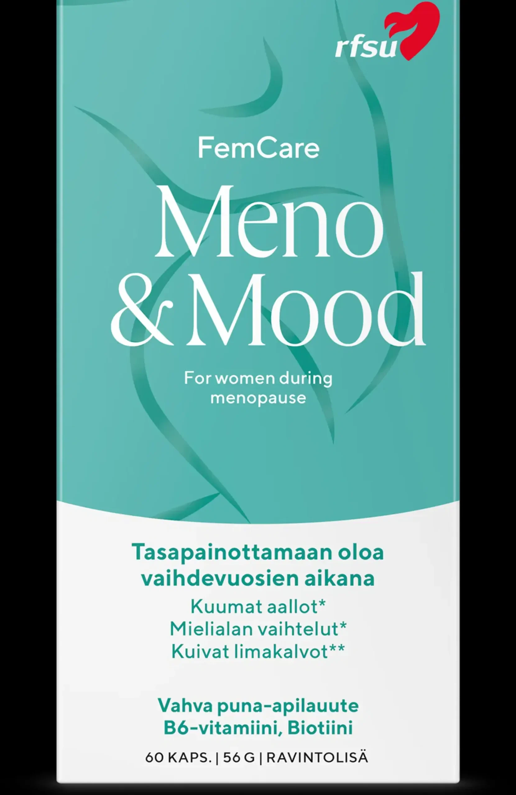 RFSU Meno & Mood tasapainottamaan oloa vaihdevuosien aikana, ongelmiin, kuten kuumat aallot, hikoilu, mielialan vaihtelut, levottomuus ja kuivat limakalvot. Ainutlaatuinen yhdistelmä puna-apilaa, B6-vitamiinia* & biotiinia**. Sisältää vahvaa puna-apilauutetta ja tarjoaa 80 mg vuorokausiannoksen isoflavoneita. Puna-apilauute auttaa naisia selviytymään kuumista aalloista, hikoilusta, mielialan vaihteluista ja levottomuudesta vaihdevuosien aikana. 100% vegaaninen. Ei sisällä eläinperäisiä ainesosia.