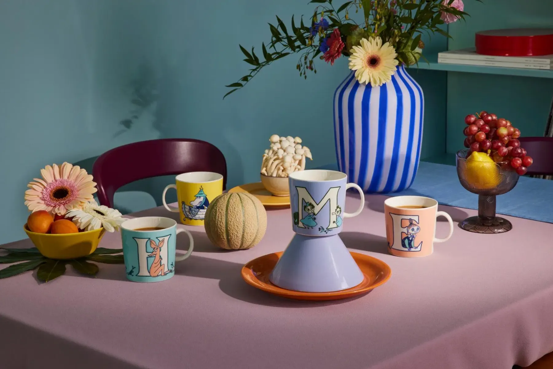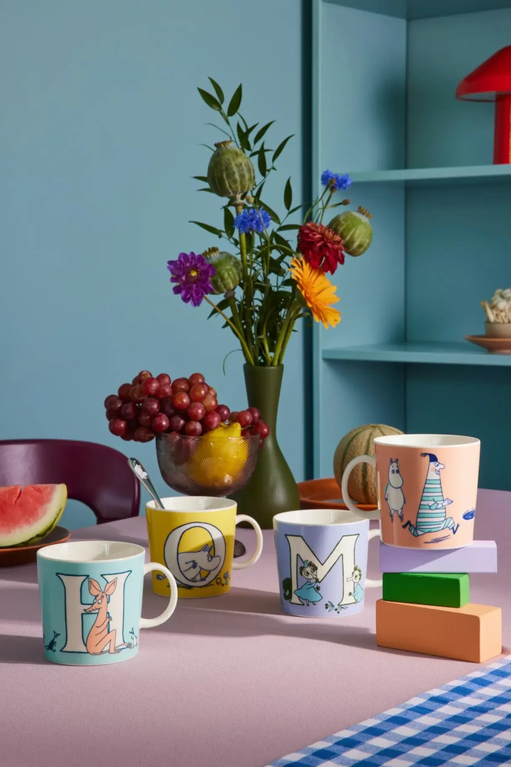 E-mukissa Muumit jättävät talviunet välistä ja tapaavat urheiluun hurahtaneen Virkkusen. Herra ei ole Muumipeikon mieleen, mutta Mymmeli rakastuu tähän voimaa uhkuvaan herraan heti. ABC-kokoelmaan kuuluvan suuremman mukin kääntöpuolen kuvitus on saanut inspiraationsa “Vaarallinen talvi” -sarjakuvasta. Moomin by Arabia, muki 0,4l, ABC E