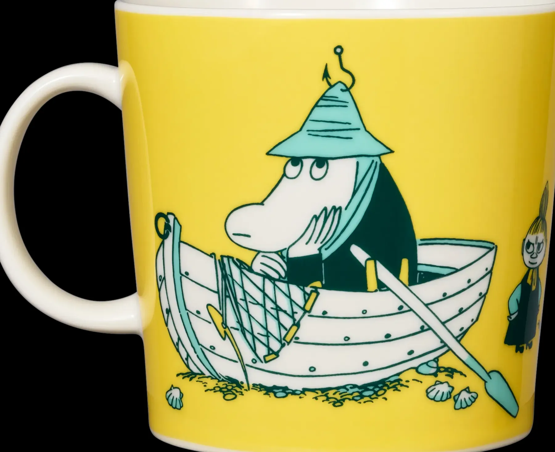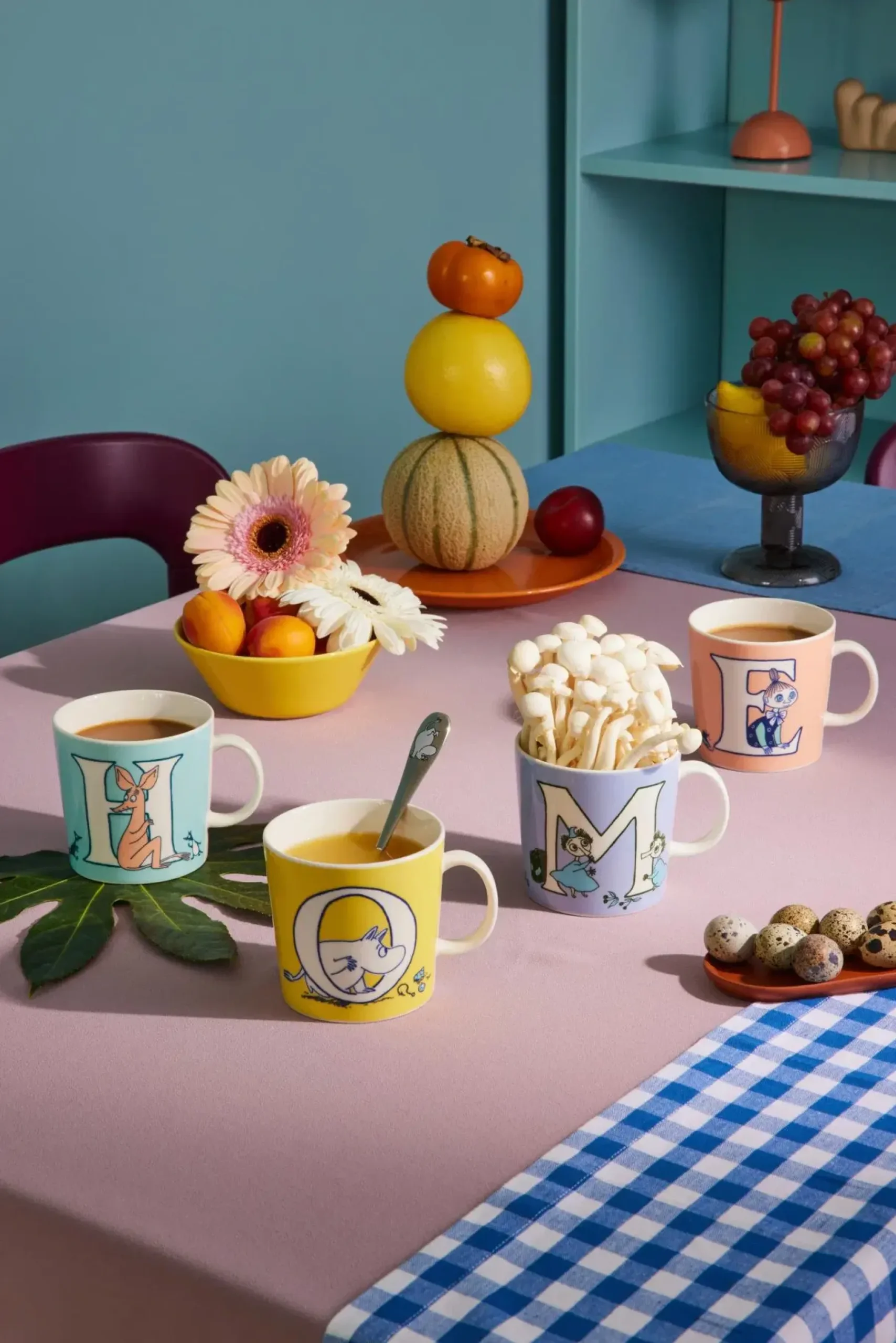 O-mukissa maailmanloppu uhkaa Muumilaaksoa, ja outoja alkaa tapahtua. Asukkaat päättävät selvittää, mistä on kyse. ABC-kokoelmaan kuuluvan suuremman mukin kääntöpuolen kuvitus on saanut inspiraationsa “Muumipeikko ja pyrstötähti” -sarjakuvasta. Moomin by Arabia, muki 0,4l, ABC O
