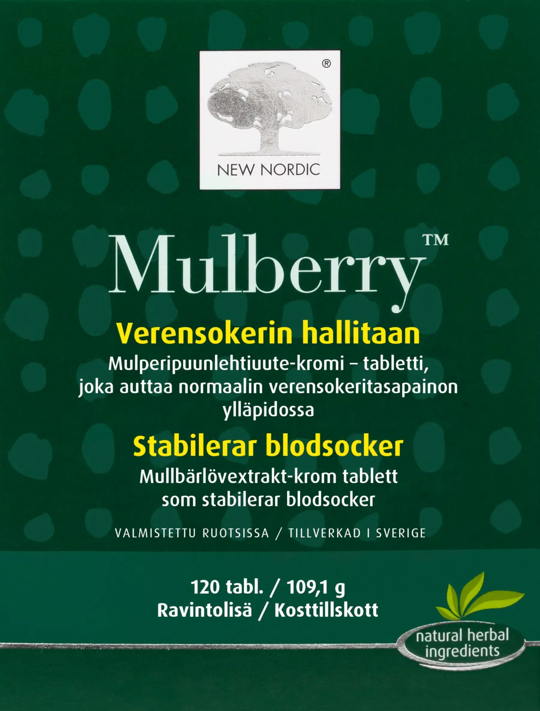 Mulperipuunlehtiuute-kromi valmiste verensokerin hallintaan. Mulberry™ tabletit on tarkoitettu henkilöille, jotka haluavat tukea verensokeritasapainon hallintaan. Tabletit perustuvat perinteiseen Japanilaiseen yrttiyhdistelmään. Kromi auttaa ylläpitämään normaalia verensokeritasapainoa ja tukee painonhallintaa. Muperipuulehtiuute edesauttaa tasapainottamaan elimistön hiilihydraattianeenvaihduntaa. Valmistusmaa Ruotsi.