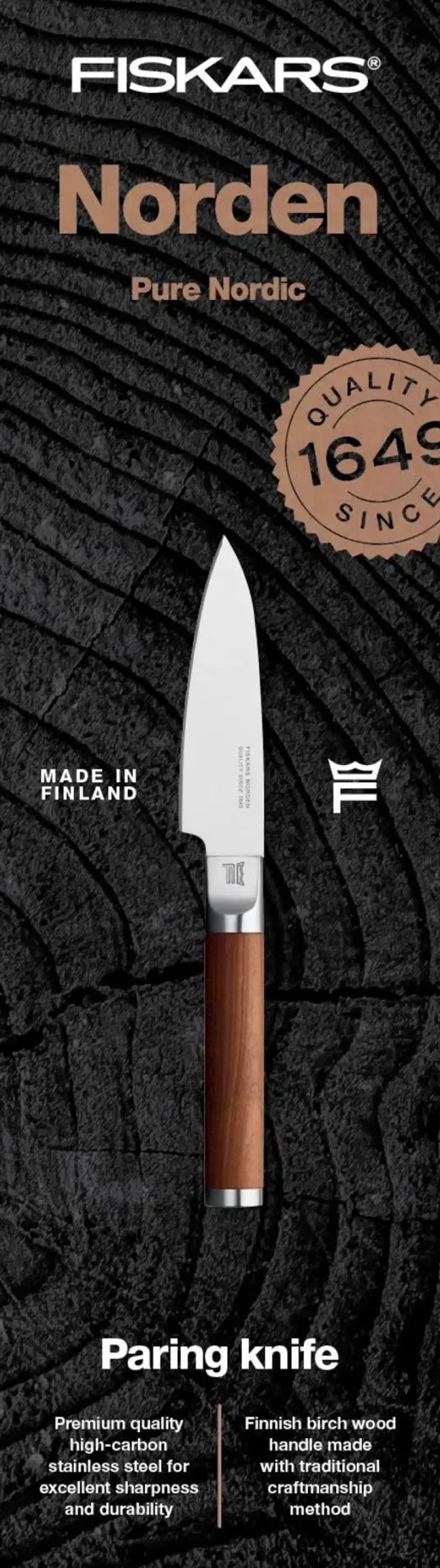 Fiskars Norden vihannesveitsi. Fiskarsin Norden-veitset valmistetaan ensiluokkaisista materiaaleista. Laadukas veitsenterä on kestävää kovaterästä, joka pysyy terävänä pitkään. Tehokkuutta lisää optimaalinen 26 asteen teroituskulma. Mitat: 28 x 7,8 x 2,7 cm.