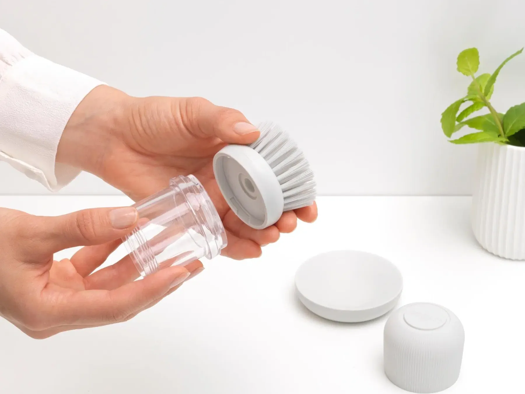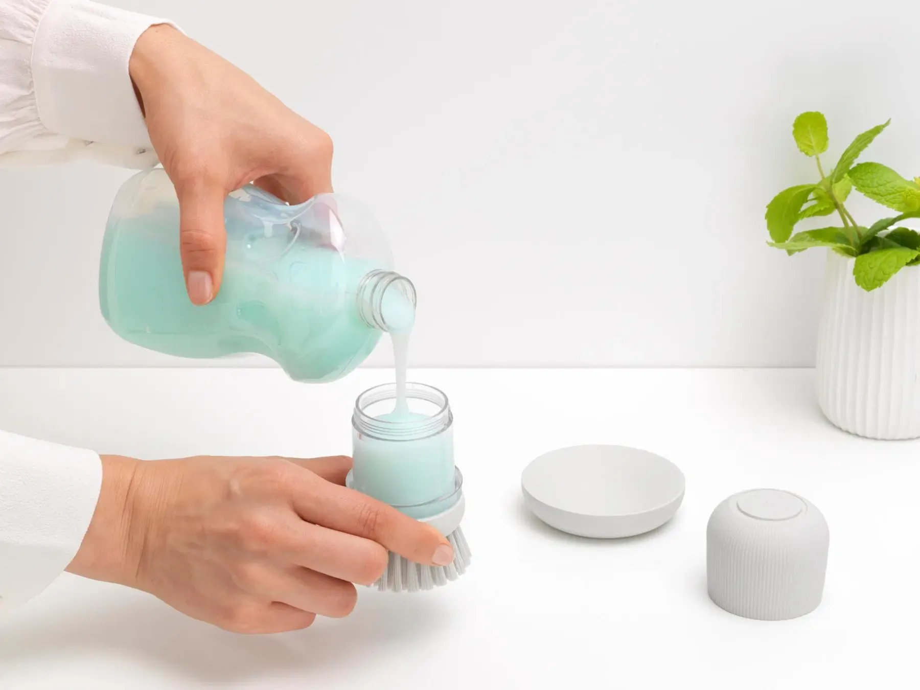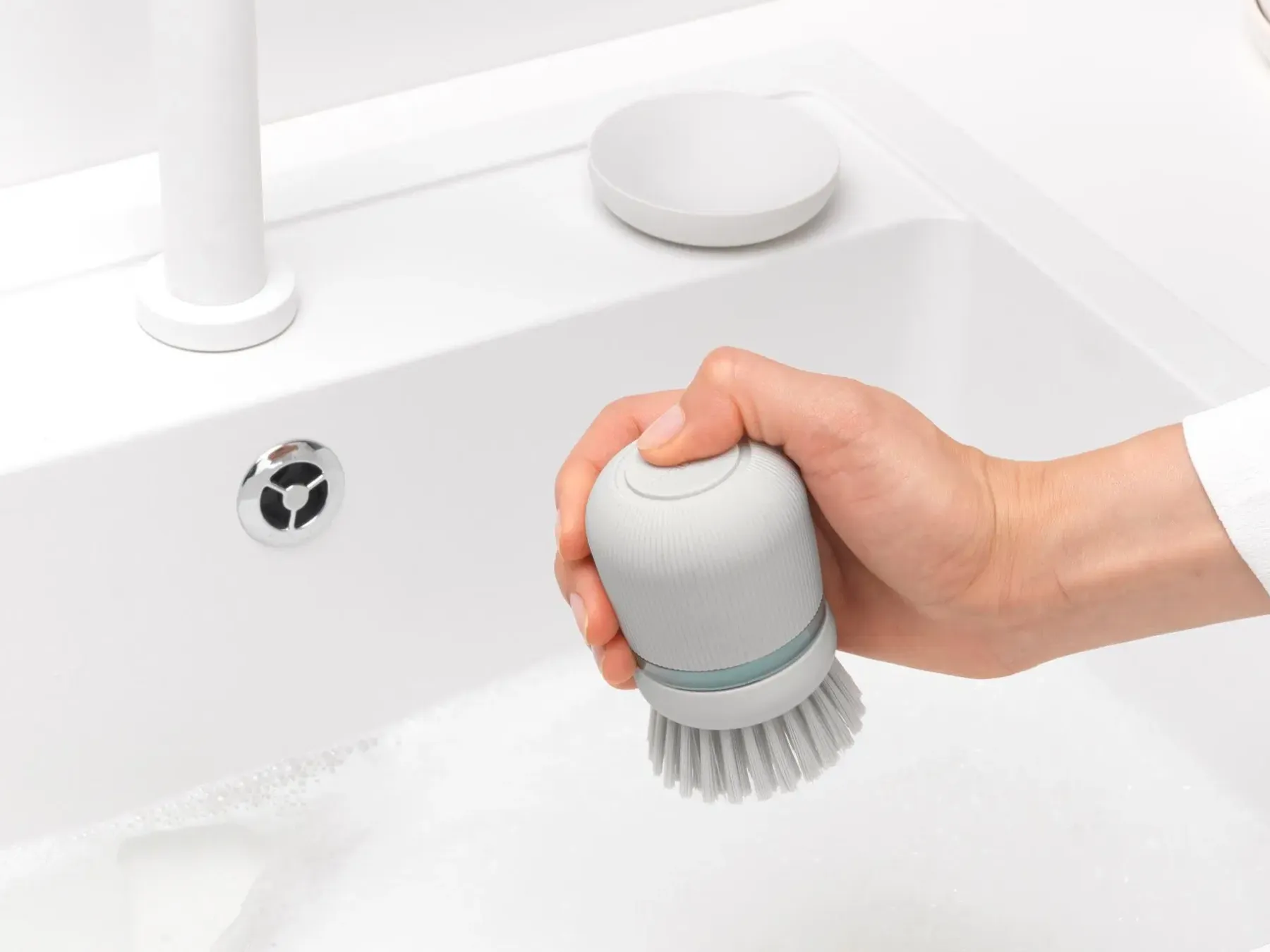 Välitön raaputusteho. Tiskaaminen on helppoa Brabantia SinkSide saippuaa annostelevalla tiskiharjalla! Paina painiketta saadaksesi tarvitsemasi määrä tiskiainetta ja pyyhkäise pois. Kestävät polyesteriharjakset ovat riittävän tukevia kuuraamiseen, mutta tarpeeksi pehmeät, jotta ne eivät naarmuta. Valmis? Säilytä harjasi kätevästi sen näppärässä pidikkeessä. Tukeva kaveri nopeisiin pesuaskareisiin.