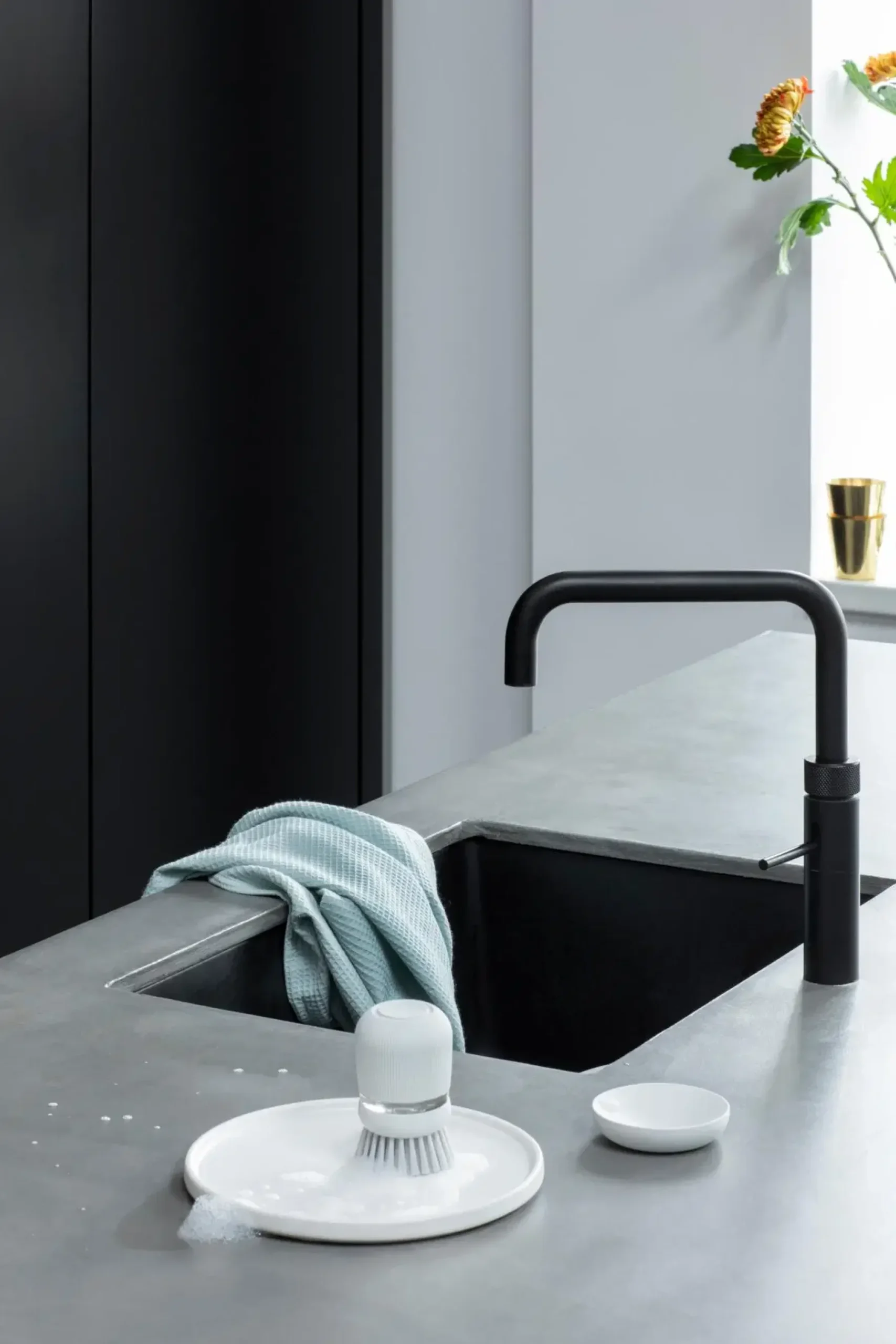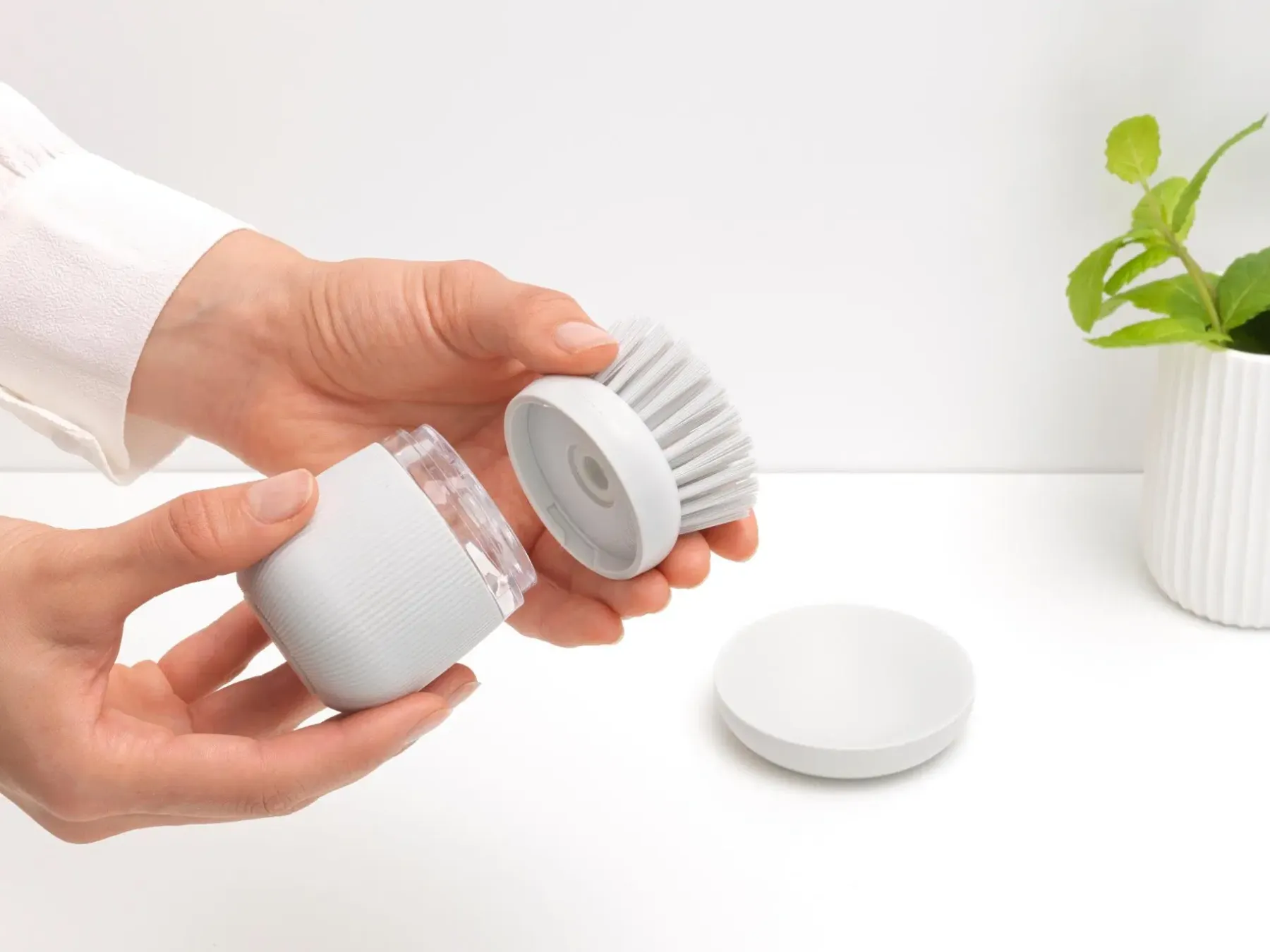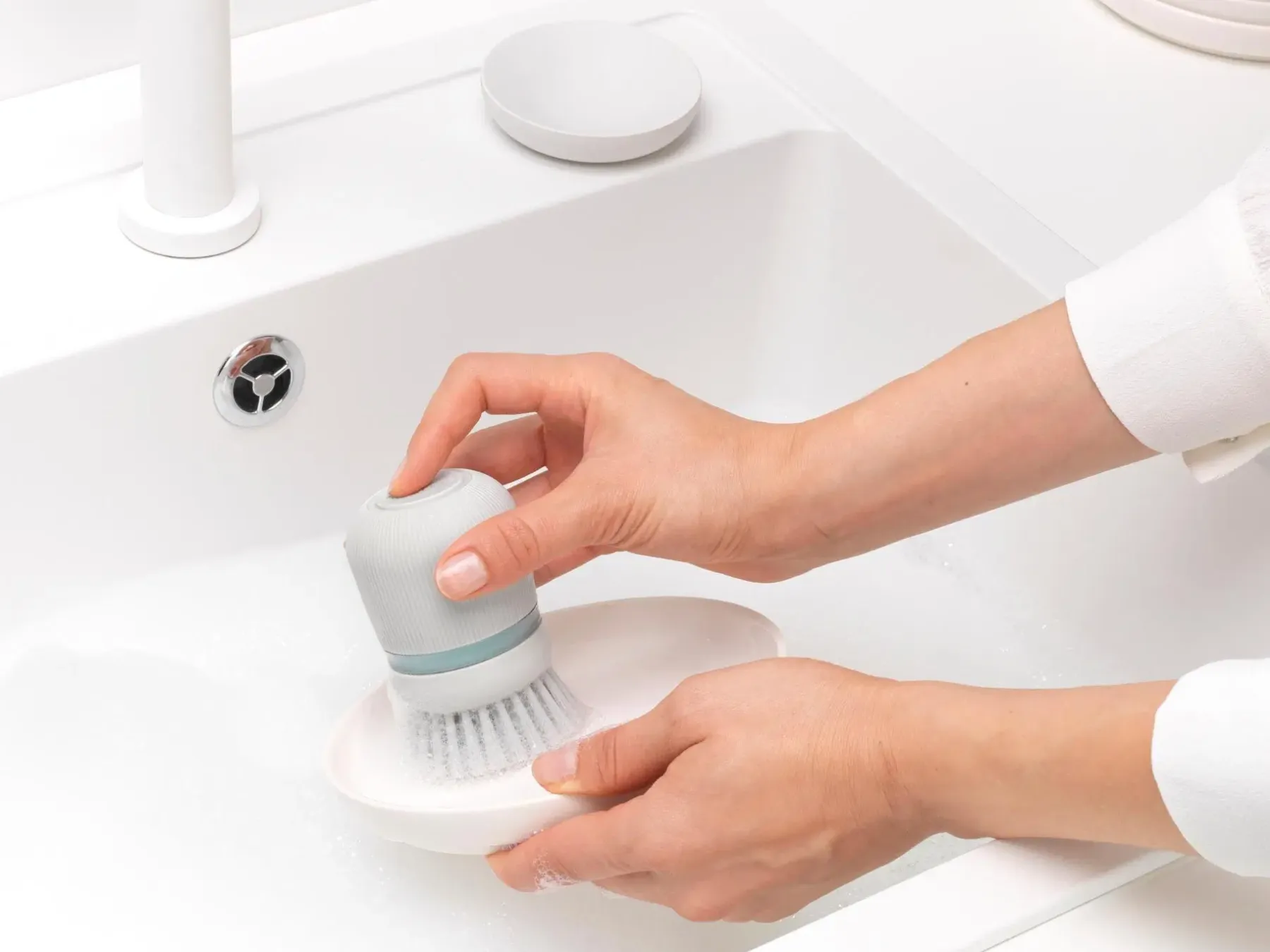 Välitön raaputusteho. Tiskaaminen on helppoa Brabantia SinkSide saippuaa annostelevalla tiskiharjalla! Paina painiketta saadaksesi tarvitsemasi määrä tiskiainetta ja pyyhkäise pois. Kestävät polyesteriharjakset ovat riittävän tukevia kuuraamiseen, mutta tarpeeksi pehmeät, jotta ne eivät naarmuta. Valmis? Säilytä harjasi kätevästi sen näppärässä pidikkeessä. Tukeva kaveri nopeisiin pesuaskareisiin.