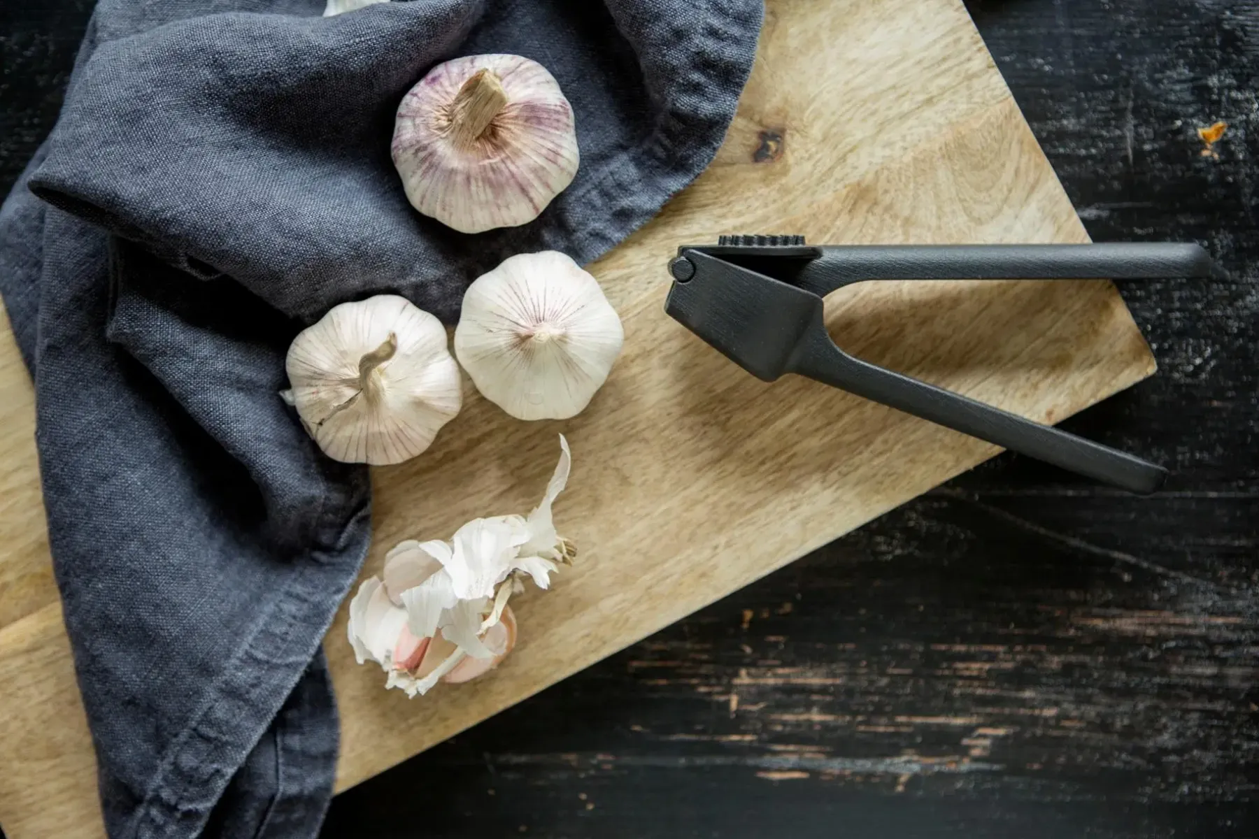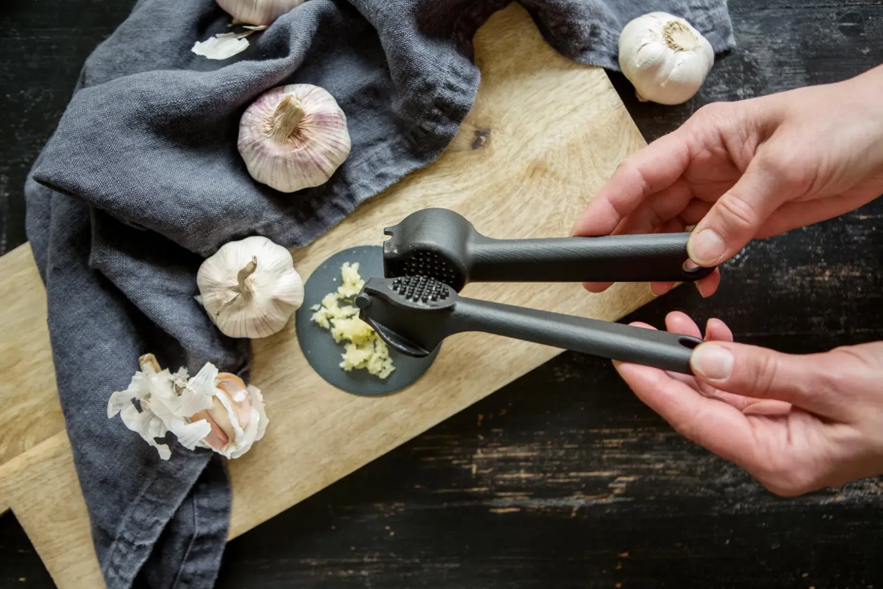 Murskaa valkosipulinkynnet nopeasti ja siististi. Helppo puristaa kynnet myös kuorineen, kuori jää puristimeen. Toisistaan irrotettavat kahvat ja puhdistuspiikit helpottavat valkosipulipuristimen puhdistamista.