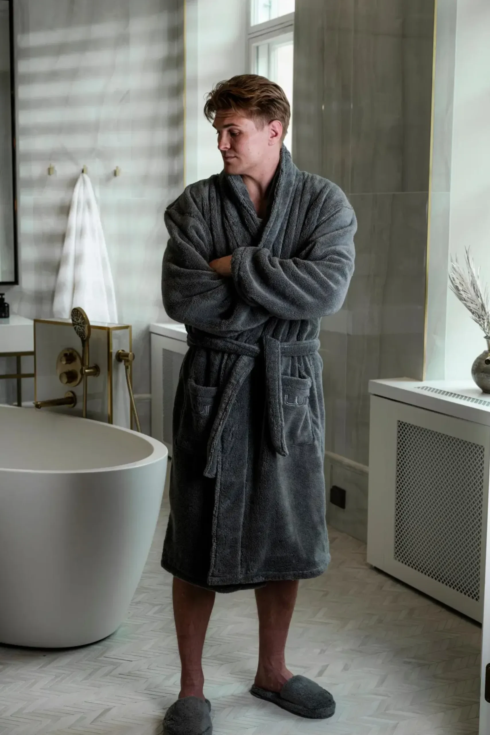 Tämä ylellisen muhkea kylpytakki on modernia suomalaista designia sinulle, joka tykkäät hemmotella itseäsi. Kylpytakki on valmistettu Luin Livingin Your Home – Your Spa -tuoteperheen omasta pyyhemateriaalista, joka on ylellisen pehmeää ja erittäin imukykyistä 100 % puuvillaa. Kylpytakissa on suuret taskut joissa on tyylikkäät metallihohtoiset brodeeraukset. Lisäksi vyö on kätevästi kiinni takin selkämyksessä. Materiaalin ylellisyys sekä harmoninen värimaailma tuo todellisen spatunnelman jokaiseen kotiin.