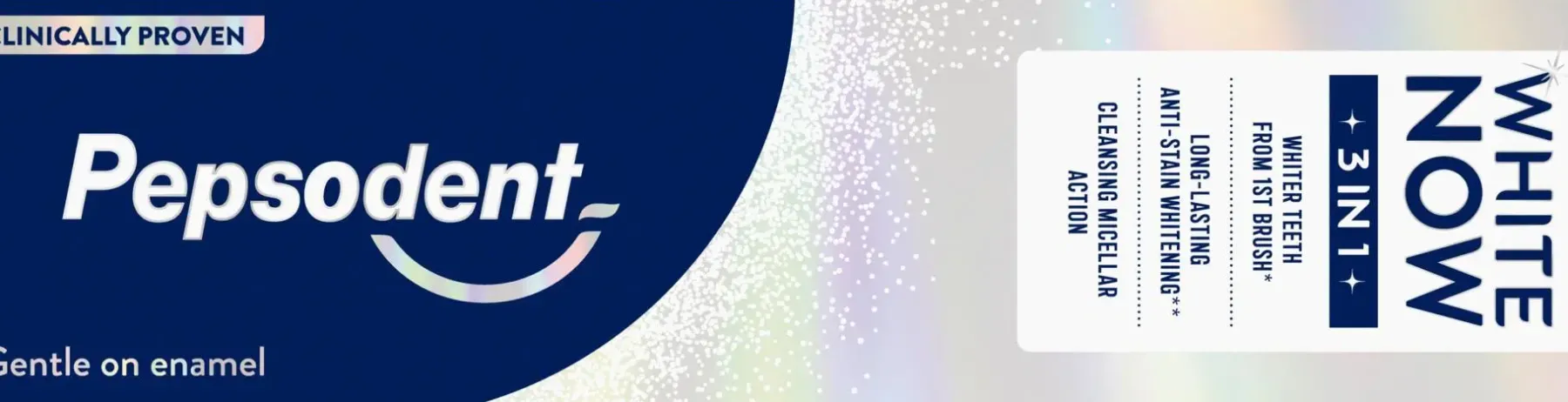 Uusi Pepsodent White Now 3in1 -hammastahna tekee hampaista välittömästi valkoisemmat ja antaa sinulle säteilevän hymyn heti ensimmäisellä harjauksella. Sen sisältämä Triple Light™ -teknologia auttaa tekemään hampaista valkoisemmat kolmivaikutteisesti, samalla kun se on hellävarainen kiilteelle. Saa nyt upea hymysi takaisin!