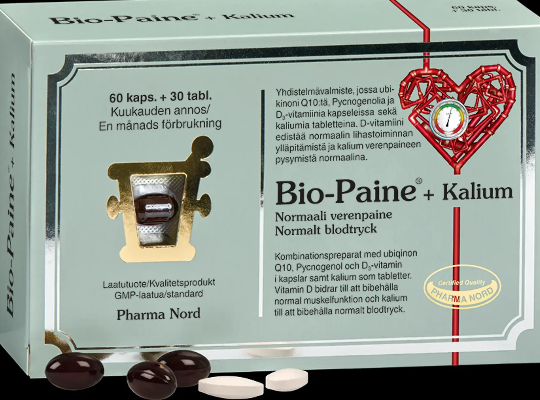 Bio-Paine®+Kalium on ravintolisä, joka sisältää kaliumia, joka edesauttaa verenpaineen pysymistä normaalina. Tuote sisältää myös ubikinonia (koentsyymi Q10), pycnogenol-uutetta ranskalaisen rannikkomännyn (Pinus pinaster) kuoresta sekä D-vitamiinia, joka edistää normaalin lihastoiminnan ylläpitämistä ja immuunijärjestelmän normaalia toimintaa.